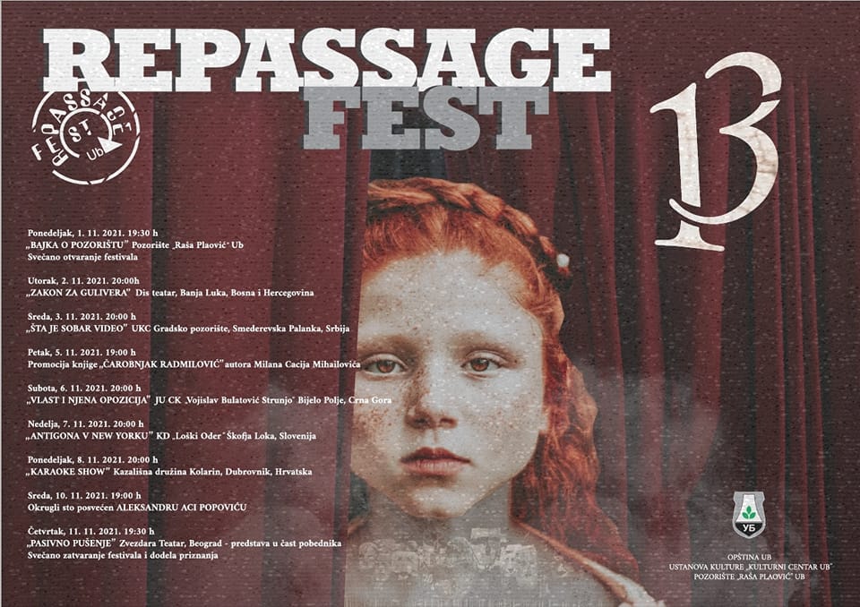 Trinaesti pozorišni festival Repassage fest biće održan od 1. do 11. novembra u Domu kulture Ub u organizaciji Ustanove za kulturu „Kulturni centar Ub” i Pozorišta „Raša Plaović”. Generalni pokrovitelj festivala je Opština Ub. Na ovogodišnjem Repassage festu nastupiće pet takmičarskih predstava amaterskih pozorišta sa prostora bivše SFRJ, kao i po jedna predstava u revijalnom programu i u čast pobednika. Sastavni deo festivala je i okrugli sto posvećen Aleksandru Popoviću. Umetničke domete predstava i glumaca ocenjuje stručni žiri, sastavljen od teoretičara, stvaralaca i poznavalaca pozorišne umetnosti.