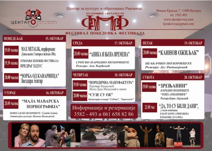 Centar za kulturu i obrazovanje Rakovica ove godine, po jedanaesti put, organizuje Pozorišne svečanosti FESTIVAL POBEDNIKA FESTIVALA. Festival se održava u periodu od 15.-20.10.2018.godine.