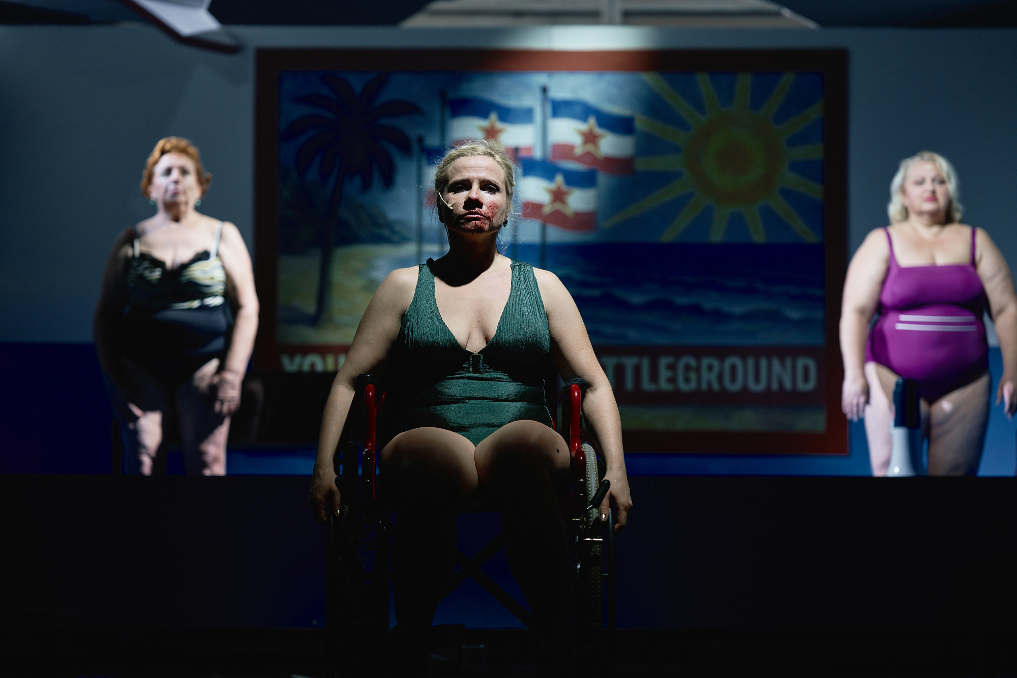 Scenografija se menja velikom brzinom, pokretna je i fluidna kroz sva četiri čina. U četvrtom činu to je avion u kom se (ne) putuje ka Moskvi, ili možda ka nekom nepoznatom, nedosanjanom i nedostižnom mestu. Potom se pred publikom otvaraju prostori trpezarije i sobe, dok u prvom činu likove posmatramo u i oko bazena. Svetlosni efekti i uživo izvođenje muzičkih numera dopunjuju slojevitost rediteljske zamisli. Oni nisu samo prateći elementi, već postaju i važan deo glumačke igre, „partneri” na sceni, koji u stopu prate i pojačavaju glumački izraz.