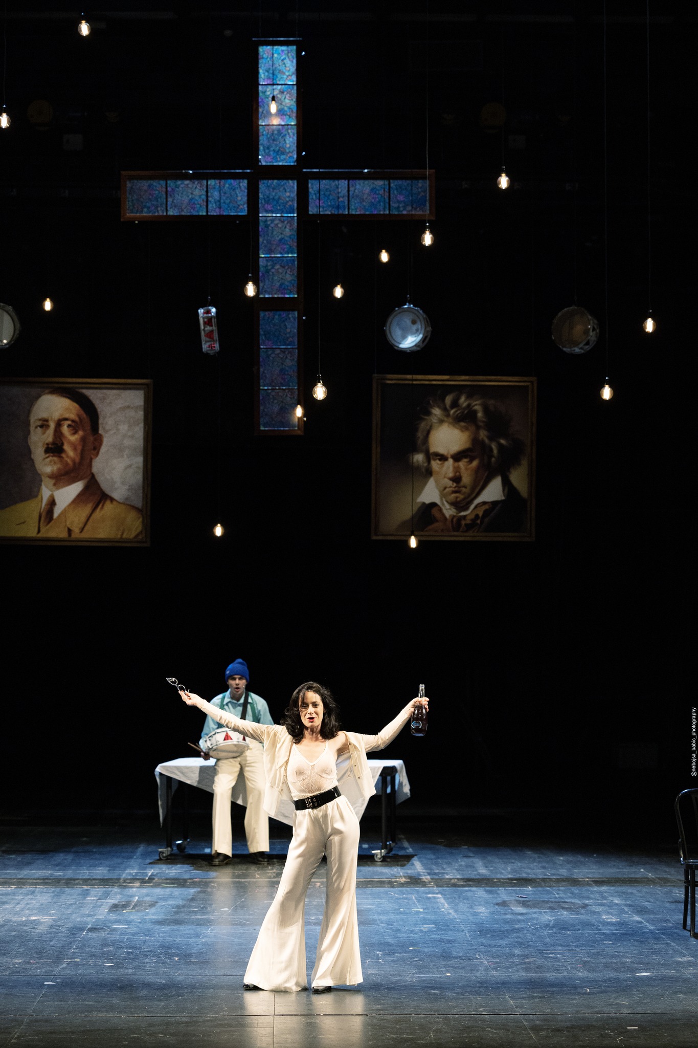 Pre svega, šareni kostimi i razigrana scenografija, ali i način na koji se scene dinamično smenjuju poput komičnih skečeva, stvaraju prividno prijatnu i lepršavu atmosferu. Ipak, publika ubrzo prepoznaje satirični ton i čitava priča postaje izmeštena. Odjednom nam se osmesi likova učine usiljenim, a njihova dela sebičnim, te možemo da razumemo zašto je Oskar doneo svoju radikalnu odluku. Pa opet, ne smemo zaboraviti da je ono što gledamo niz prisećanja glavnog junaka koji je u trenutku pripovedanja pacijent duševne bolnice. Dakle, sve što znamo o ostalim likovima jeste ono što čujemo od njega. U ovom kontekstu, Oskar je ultimativni nepouzdani pripovedač. Poput Foresta Gampa, njegova životna priča nepredvidiva je i burna, a upečatljive epizode koje je proživeo često srceparajuće. Dok nam pripoveda o svom životu, pribegava limenom dobošu koji na tom nivou funkcioniše kao sredstvo pomoću koga oživljavava uspomene i orijentiše se na putovanju kroz sećanja. Doista, ovaj instrument kao da je zaseban lik u predstavi. On je simbol otpora, pobune, protesta protiv normalizovanih izvitoperenosti, ali i izolacije i zida koji Oskara večito odvaja od okoline. Zaglušujuća buka koju proizvodi Oskaru daje glas koji ponajviše zvuči kao vapaj. Prestravljen idejom da će jednoga dana postati poput odraslih, a svestan da je svakim rođendanom tome sve bliži, on poželi da zauvek ostane mali i od tada limeni doboš postaje neodvojivi deo njega samog, štit od prljavog sveta odraslih i obećanje da sâm na njih nikada neće ličiti. Doboš je i Oskarov verni saputnik, jedina konstanta u njegovom životu. Ako iko proba da mu ga oduzme, on se uznemiri i stane vrištati toliko glasno da visok pisak u trenutku slama staklo – tokom jednog takvog incidenta, nastradale su naočare njegove učiteljice. Vrištanje je još jedan način na koji Oskar pokušava da se zaštiti od surovog sveta, odbijajući da bude njegov deo. Ovaj simbol funkcioniše na još jednom nivou; neraskidivo je povezan sa stvarnim događajem koji se odigrao 9. novembra 1938. godine, širom Nemačke. Reč je o Kristalnoj noći, nacističkom pogromu na čijoj meti su bile jevrejske prodavnice čiji su vlasnici završili ili mrtvi ili uhapšeni. Jedan od najstrašnijih vesnika Holokausta. Štaviše, Sigizmund Markus, prodavac igračaka kod koga Oskar nabavlja novi doboš kada za to dođe vreme, takođe završava tragično, oduzimajući sebi život kako bi se spasio mučenja i ponižavanja od strane režima.