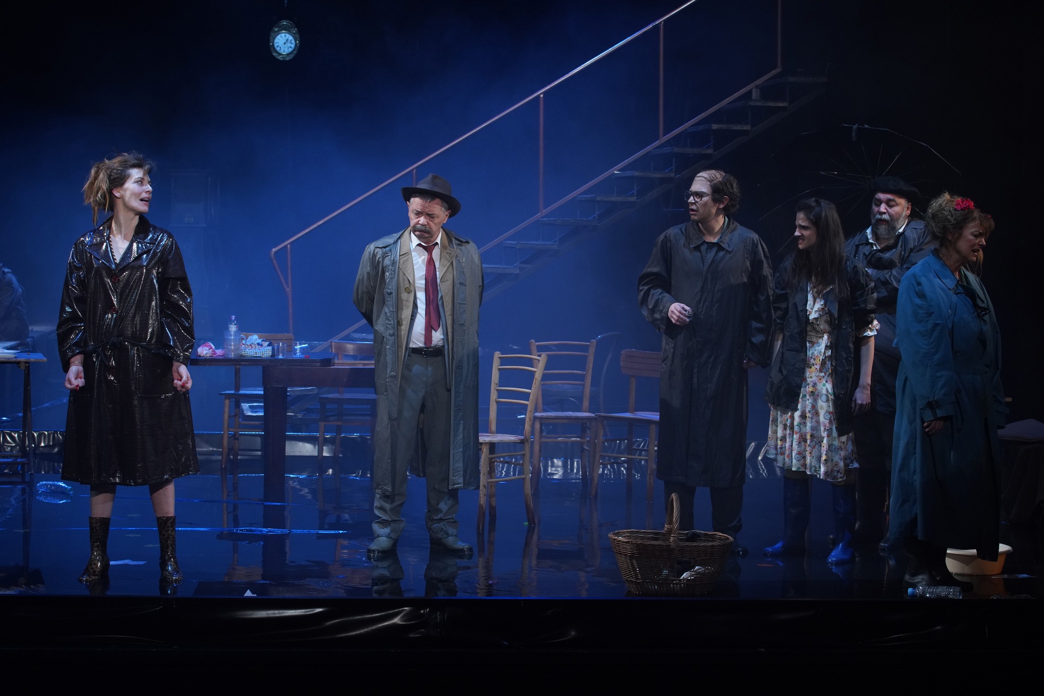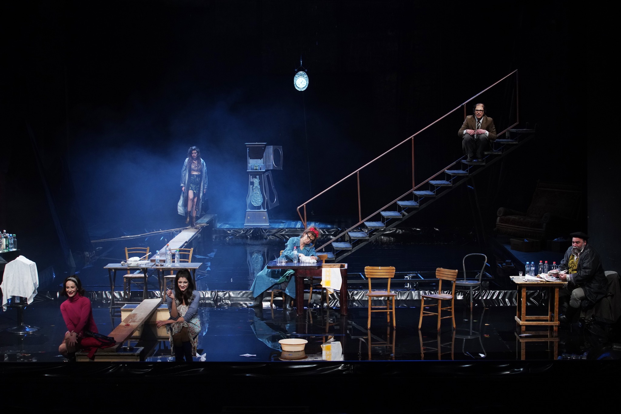 Rediteljski estetski identitet, karakterističan za Markovića, publici postaje upečatljiv već u prvim minutima izvođenja. Upečatljivost reditelja i njegova tendencija da iskoristi maksimum jedne pozorišne scene ogledaju se u scenografiji. Na mračnoj sceni ne vidimo nikakve kulise, a na celokupan pod postavljen je „bazen” pun vode, koji se završava kod hinterbine, u čijoj dubini vidimo jedan veliki sat. U bazenu nalaze se stolice i stolovi, đubre na sve strane, jedan šank i stepenice koje ne vode nikuda. Mističnost prostora i oblak dima koji u „čudesnim” trenucima poplavljuje salu, ali i prljavi prikaz kafane etiketiraju predstavu kao granicu naturalizma i fantastike, što Simovićeva drama i predstavlja. U susret premijeri sunčane prolećne dane smenila je mračna kiša, koja je kao kompliment nekoliko dana pre premijere doprinela atmosferi. Kiša na sceni pojavljivala se, smbolički, u trenucima kada je trebalo „sprati” grehe sa aktera predstave, te je time uznemirila publiku i doprinela efekat empatije prema likovima koji je i zaslužuju. Narodna muzika koja prati kafanske trenutke pažljivo je probrana, te pesmama kao što je „Ja te pjesmom zovem” reditelj jasno iskazuje da u prvi plan postavlja patnju, bol, nedostatak ljubavi i megalomaniju aktera. „Igrom” svetla i refleksijom koju stvara voda na sceni jasno je određen svaki sledeći segment drame. Osvetljivanjem sata, koji se nalazi u dubini hinterbine, reditelj naznačava da je prošao neki vremenski period između scena. Ono što publika ne zna do kraja predstave je, koliko je u stvari vremena prošlo u patnji i mizeriji?
