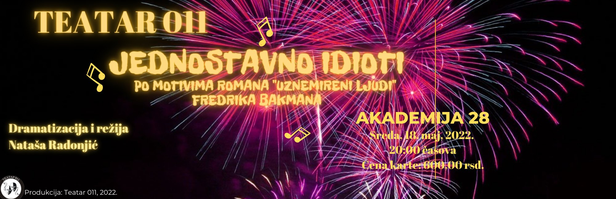 Predstava „Jednostavno idioti” u produkciji Studija glume Teatar 011, po motivima romana „Uznemireni ljudi” Fredrika Bakmana, a u dramatizaciji i režiji Nataše Radonjić biće premijerno izvedena 18. maja od 20h na sceni Akademije 28.