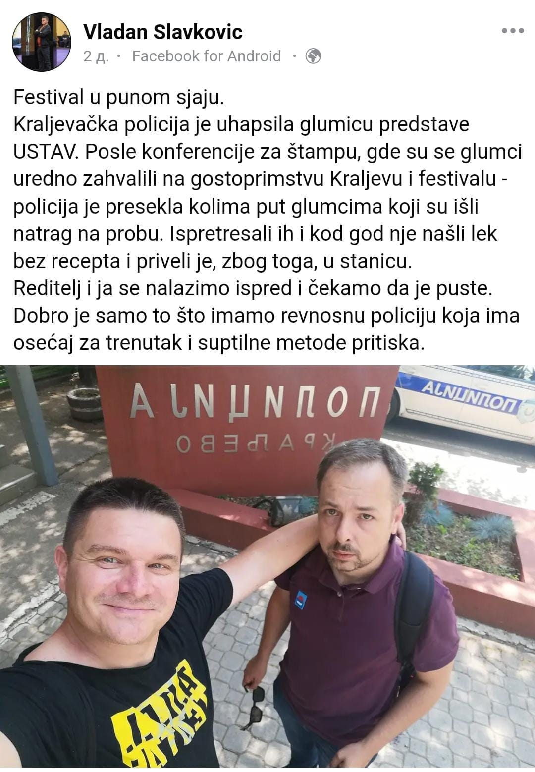 Pred premijernu izvedbu pomalo kontroverzne predstave „Ustav i prava građana” sa karakteristikama Brehtovog pozorišta, koje za cilj imaju da podstaknu akciju i delanje publike, glumica predstave Milena Božić bila je privedena u Kraljevu 30. juna, kada se vraćala sa press konferencije, sa optužbama da je posedovala opijate. Milena je kod sebe imala jednu tabletu bromazepama, ili, kao što u izveštaju policije piše, bromazepana. Uprkos onome što se moglo očekivati, ovo nije obeshrabrilo glumce niti organizatore, već je u njima probudilo plamen prkosa i dosipalo dodatno gorivo kako bi ovom predstavom dokazali da je mi, zapravo, živimo. Nije potrebno naglašavati da se ovaj događaj ne čini kao puka slučajnost, te su ga glumci i reditelj uvrstili i u sadržaj same predstave.