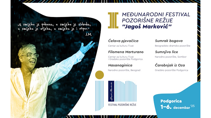 Prvo izdanje Međunarodnog festivala pozorišne režije „Jagoš Marković“ održaće se od 1. do 6. decembra u Gradskom pozorištu u Podgorici. Ovaj festival, ali i ovo izdanje festivala imaju za cilj da čuvaju sjećanje ali i da daju svojevrsni omaž najznačajnijem reditelju sa naših prostora Jagošu Markoviću