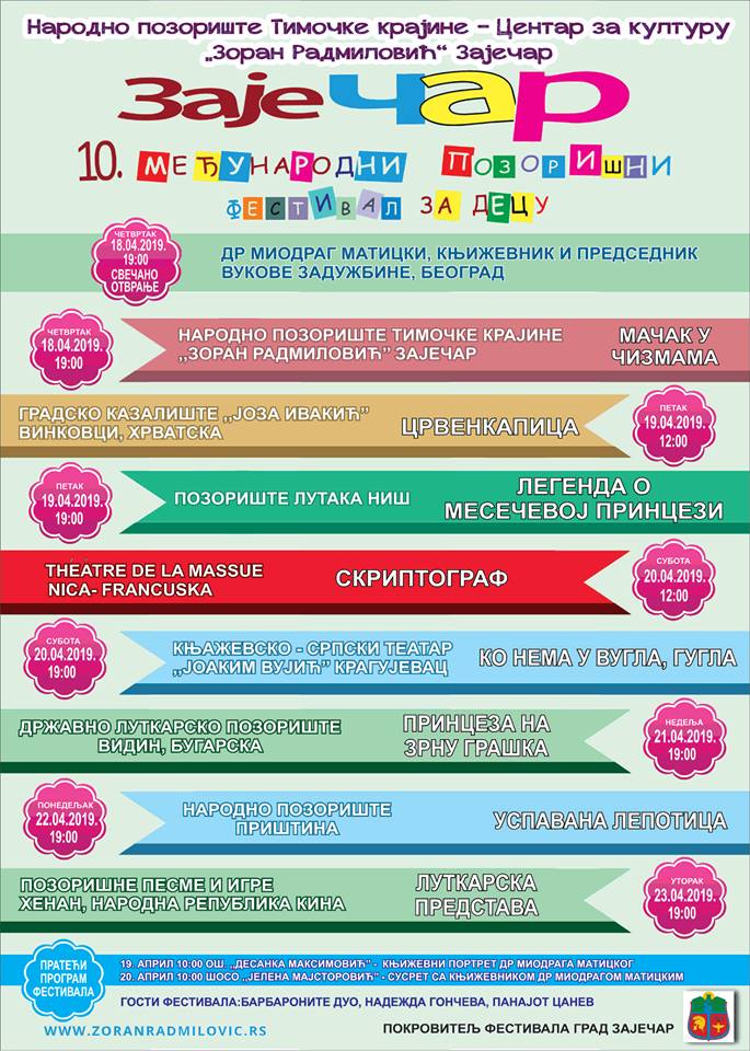 Međunarodni pozorišni festival za decu “ZajeČAR“, deseti po redu, biće održan u zaječarskom teatru od 18. do 23. aprila 2019. godine. Na dečjem festivalu učestvovaće osam pozorišta iz Srbije, Kine, Francuske, Bugarske i Hrvatske, a otvoriće ga Dr Miodrag Maticki, književnik i predsednik Vukove zadužbine.