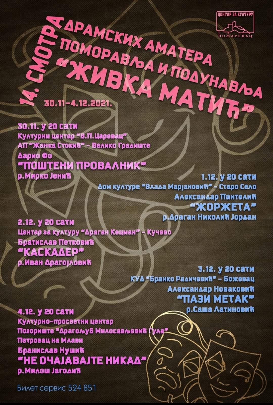 Četrnaesta po redu Smotra dramskih amatera Pomoravlja i Podunavlja „Živka Matić” tradicionalno će se održati u Požarevcu od 30. novembra do 4. decembra. Sve predstave se igraju na Velikoj sceni Centra za kulturu Požarevac sa početkom u 20h.