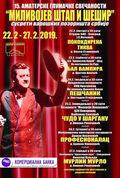 U Požarevcu će od 22. do 27. februara 2019. god. biti održana XV Smotra dramskih amatera ''Milivojev štap i šešir'', Susreti varoških pozorišta Srbije. Smotra je posvećena popularnom pozorišnom i filmskom glumcu, Milivoju Živanoviću, rođenom požarevljaninu.