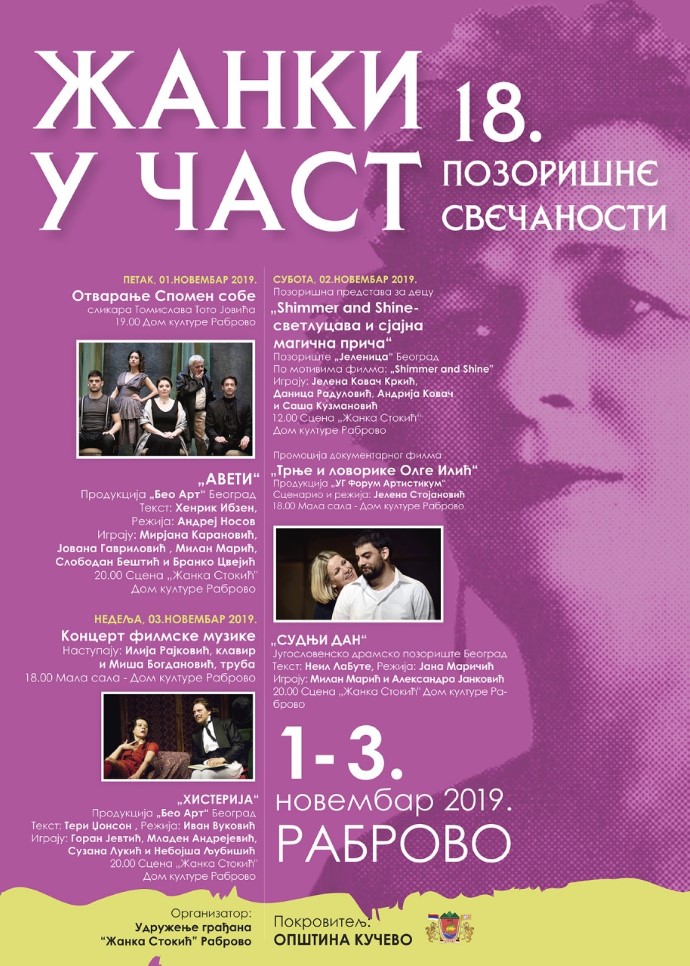 Pozorišna predstava AVETI Produkcija „Beo Art“ Beograd Tekst: Henrik Ibzen; Režija: Andrej Nosov; Igraju: Mirjana Karanović, Jovana Gavrilović , Milan Marić, Slobodan Beštić i Branko Cvejić 20.00 Scena „Žanka Stokić“- Dom kulture Rabrovo.