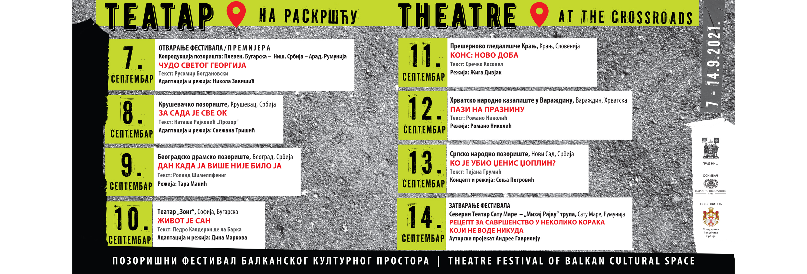 Ovogodišnji festival otvoriće predstava „Čudo svetog Georgija”, koju su zajedno radila pozorišta iz Niša, Plevena (Bugarska) i Arada (Rumunija). Publika će imati priliku da gleda predstave iz Srbije, Hrvatske, Slovenije, Bugarske i Rumunije.