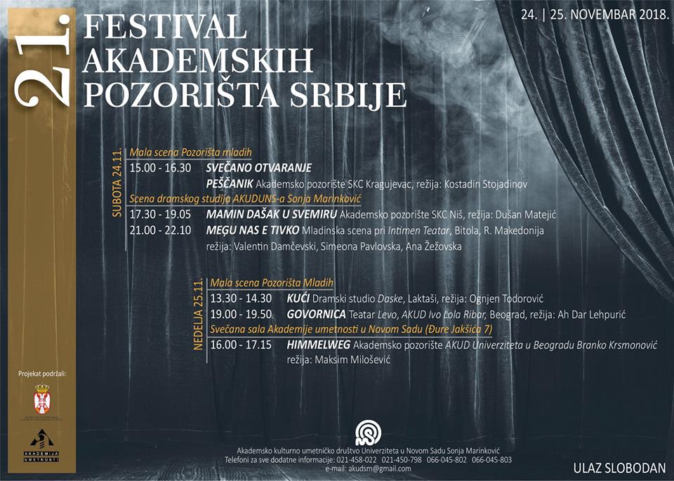Akademsko kulturno-umetničko društvo Univerziteta u Novom Sadu „Sonja Marinković“ ove godine organizuje, već tradicionalni, 21. po redu Festival akademskih pozorišta Srbije. Svečano otvaranje 21. FAPS-a održaće se u subotu, 24. novembra sa početkom u 15.00 časova na Maloj sceni Pozorišta Mladih.