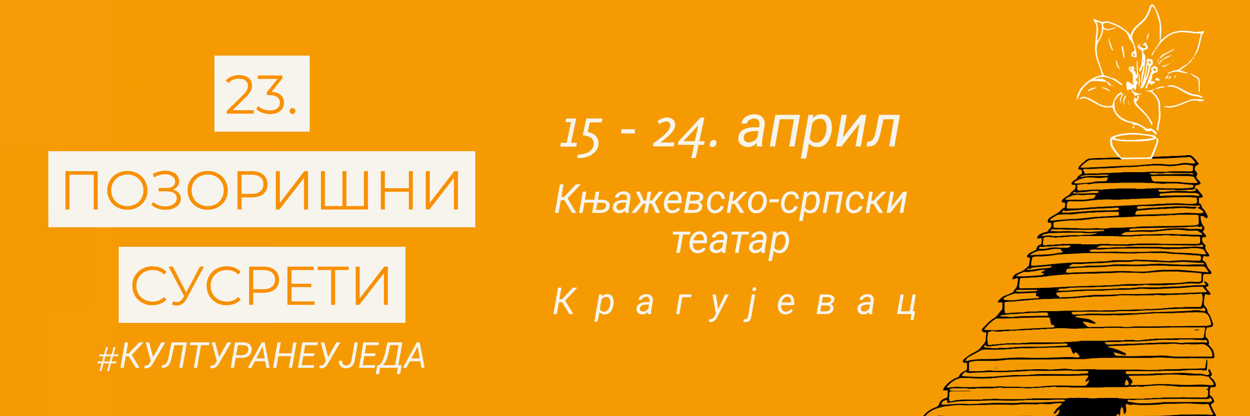Pozorišni susreti učenika gimnazija Srbije održavaju se 23. put zaredom u Kragujevcu, od 15. do 24. aprila, pod sloganom ,,Kultura ne ujeda”. Svečano otvaranje susreta je u ponedeljak, 15. aprila u 16 časova, u Knjaževsko-srpskom teatru.