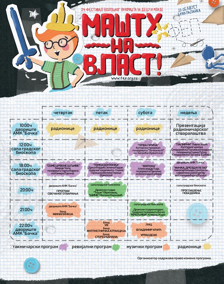 24. Festival ekološkog pozorišta za decu i mlade u Bačkoj Palanci održaće se od 23. do 26. avgusta pod sloganom "Maštu na vlast".
