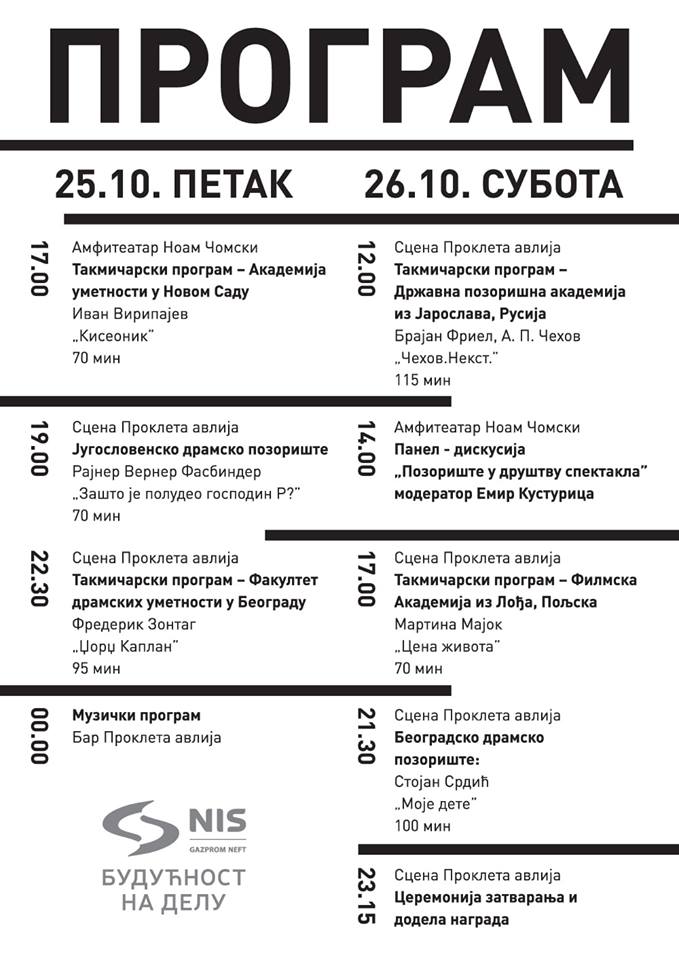 U okviru revijalnog programa, gostovaće renomirana srpska pozorišta, Jugoslovensko dramsko pozorište sa nagrađivanom predstavom „Zašto je poludeo gospodin R.“ i Beogradsko dramsko pozorište sa predstavom „Moje dete“.