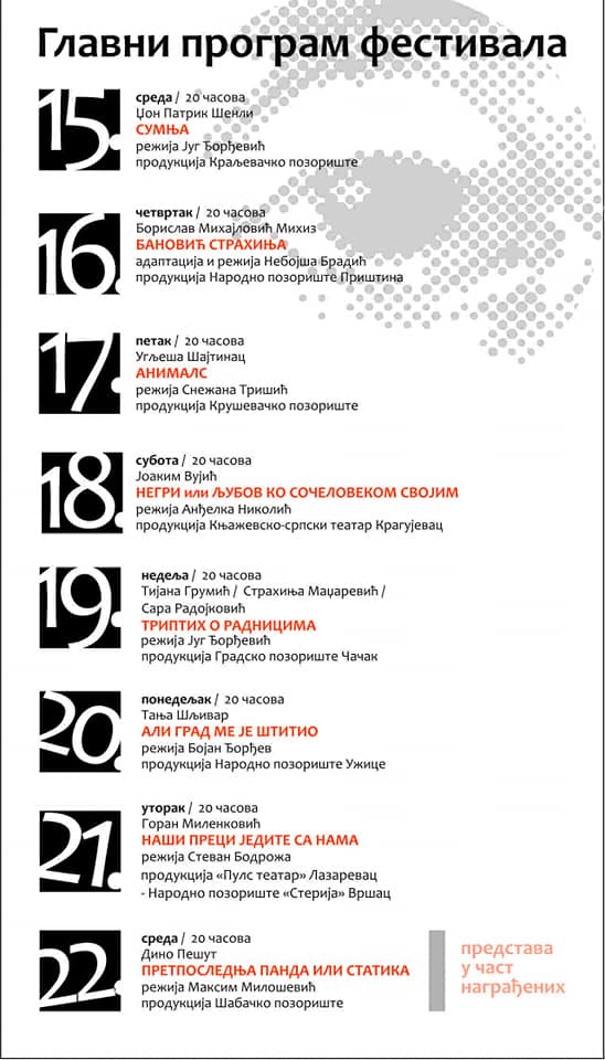 Pretposlednjeg dana festivala nastupiće užičko pozorište sa predstavom ,,Ali grad me je štitio“, urađenoj po tekstu Tanje Šljivar, a u režiji Bojana Đorđeva. Festival zatvaraju glumci iz narodnih pozorišta Lazarevca i Vršca predstavom ,,Naši preci jedite sa nama“, za koju je tekst napisao Goran Milenković, a režirao je Stevan Bodroža. Programom je predviđeno da u čast nagrađenih šabačko pozorište izvede predstavu ,,Pretposlednja panda ili statika“ po tekstu Dina Pašuta, a i režiji Maksima Miloševića.