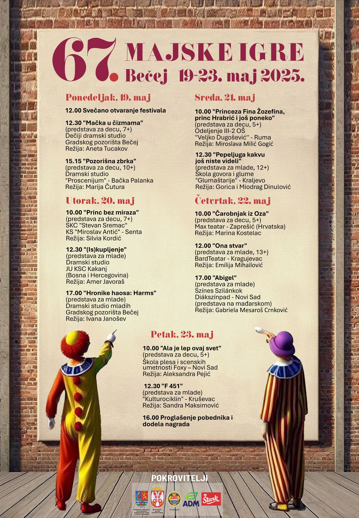 Pozorište Bečej objavilo je kompletan program 67. izdanja festivala „Majske igre“, koji će biti održan od 19. do 23. maja 2025. godine.
