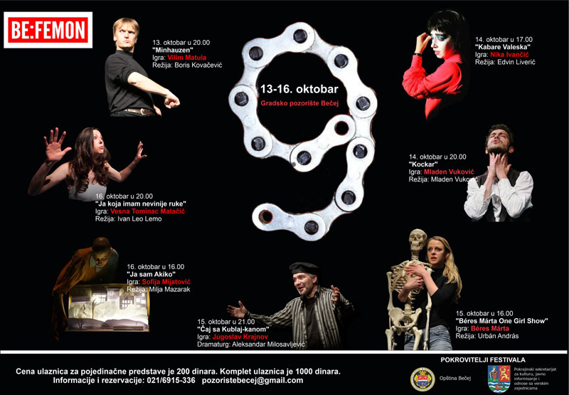 U cilju osvetljavanja i osnaživanja monodrame kao svojeverne i zasebne forme u sklopu brojnih vidova teatarske umetnosti, od 13. do 16. oktobra u Gradskom pozorištu Bečej, očekuje nas deveti po redu Be:femon – Bečejski festival monodrame. Ovaj festival pruža šansu specifičnoj dramskoj vrsti koja izražava veštine pojedinačnog glumca na sceni. Prepušten sam sebi, odnosno isključivo svom glumačkom talentu, umeću i tehnikama ove umetnosti, pravi i veliki glumci rado odgovaraju zahtevima koje pred njih postavlja monodrama.