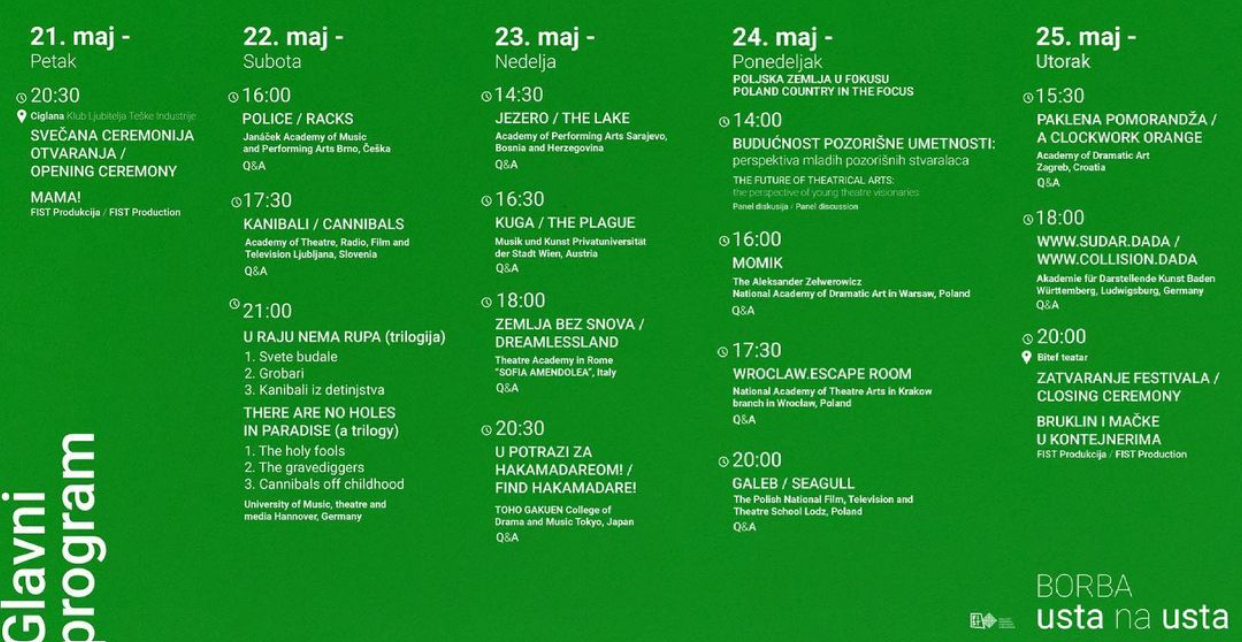 Pod sloganom „USTA NA USTA”, Festival internacionalnog studentskog teatra- FIST u organizaciji studentkinja i studenata Fakulteta dramskih umetnosti, Katedre za menadžment i produkciju pozorišta, radija i kulture tradicionalno će se održati po 16. put od 21. do 25. maja. Tema ovogodišnjeg izdanja festivala je borba, u kontekstu aktuelne situacije u kojoj se nalazimo, ali i pitanja lične borbe koju kao pojedinci svakodnevno vodimo. U okviru krovne teme, fokus ovogodišnjeg festivala biće usmeren na pitanje klimatskih promena i potreba za povećanjem svesti o ovom problemu, a koje je kroz slogan i identitet festivala simbolično prikazan kao borba za život. FIST16 će problemski i programski biti realizovan u skladu sa potrebom zelene transformacije i prilagođavanja u polju kulture. Ova filozofija biće primenjivana i produkciono - zamenom reflektora koji štete atmosferi LED reflektorima, smanjenom, gotovo nepostojećom štampom papira, te distribucijom svih informacija u virtuelni prostor, reciklažom i ponovnom upotrebom postojeće scenografije i kostima.