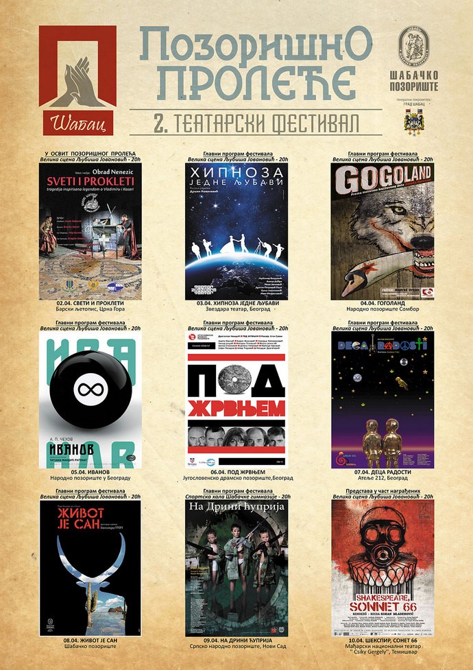 Pozorišno proleće, teatarska svetkovina biće ove godine održana po drugi put, od 2. do 10. aprila u Šapcu kao svojevrsni nastavak jugoslovenskog festivala Ljubiše Jovanovića koji je ugašen kada se raspala Jugoslavija. Selekciju čini sedam predstava pozorišnih kuća iz Beograda, Novog Sada, Sombora i Šapca, a potpisao je selektor i direktor Šabačkog pozorišta, Zoran Karajić. Festivalski savet i ove godine čine: Dušan Kovačević, predsednik, Mira Banjac, Vojislav Brajović, Nikita Milivojević, Nebojša Bradić, Svetislav Basara, Svetislav Jovanov, Milivoje Mlađenović i Dragana Bošković. Žiri festivala činiće umetnici iz okruženja: Milena Zupančič, glumica; Zijah A. Sokolović, glumac i Blagoj Stefanovski, predsednik NETA (Nova Evropska Teatarska Akcija). Kada je žiri u pitanju, namera Zorana Karajića jeste da okupi ljude iz regiona, da oni stručno procene kakvu pozorišnu estetiku zagovaraju srpska pozorišta i da nagrade najbolje. Žiri novinara je u sastavu: Borka Trebješanin (Politika), Vukica Strugar (Večernje novosti) i Tatjana Nježić (Blic).