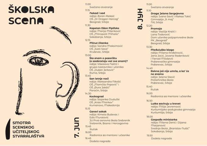 Program „Školska scena” se organizuje u okviru „Smotre scenskog učiteljskog stvaralaštva“ koja je počela 31. maja u Leskovcu, a 7. i 8. juna u Lebanu će se predstaviti amaterske trupe osnovaca i srednjoškolaca iz Srbije i regiona. Sve predstave ovog programa biće odigrane u Domu kulture „Radan“.