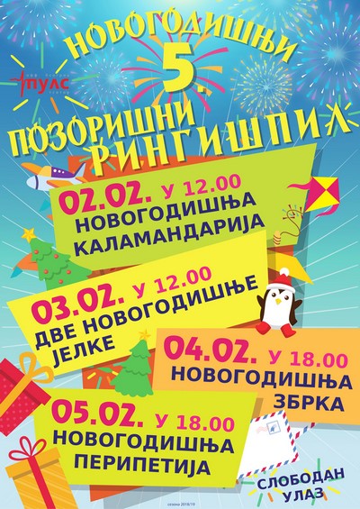 Od 02.-05.02.2019.godine u organizaciji Puls Teatra u Centru za kulturu Lazarevac, održava V Novogodišnji pozorišni ringišpil. Naši najmlađi sugrađani moći će da pogledaju četiri predstave: " Novogodišnja kalamandarija", " Dve novogodišnje jelke ", " Novogodišnja zbrka " i " Novogodišnja peripetija ". Posetioci će, i ovoga puta, nakon svake odigrane predstave imati priliku da ocene odgledanu predstavu, i izglasaju najbolju predstavu ovogodišnjeg Festivala. Ulaz za sve predstave je besplatan.