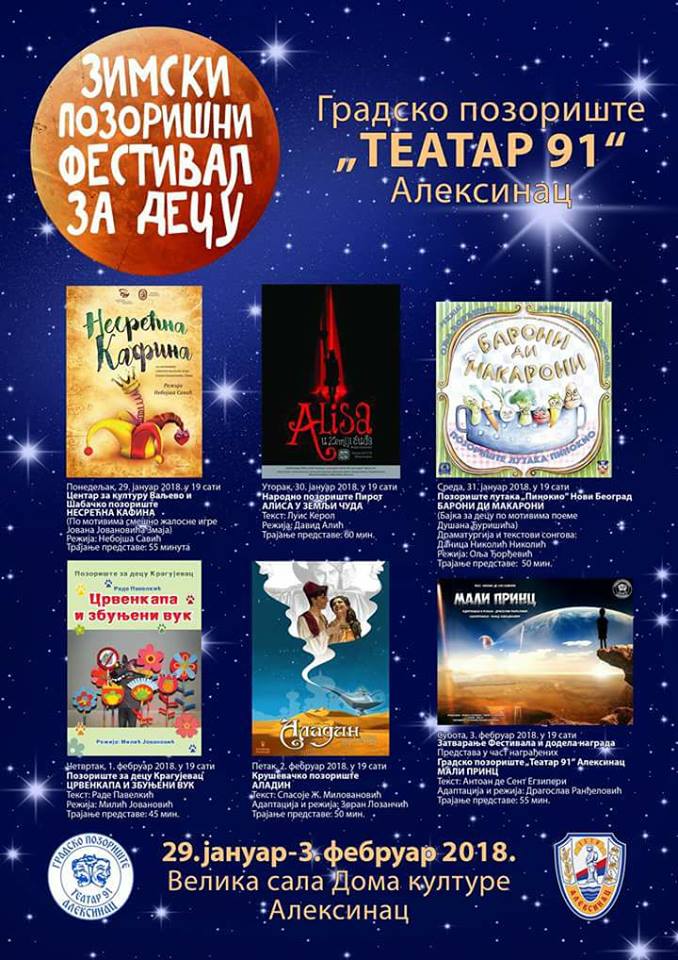 Prvi Zimski pozorišni festival za decu će otvoriti predstava Nesrećna Kafina, po motivima rragikomične igre Jovana Jovanovića Zmaja, u režiji Nebojše Savića, a u koprodukciji Centra za kulturu Valjevo i Šabačkog pozorišta. Zatim će Narodno pozorište Pirot izvesti predstavu Alisa u zemlji čuda, po tekstu Luisa Kerola i u režiji Davida Alića. Pozorište lutaka „Pinokio“ Novi Beograd predstaviće se aleksinačkoj deci predstavom Baroni di Makaroni (bajka za decu po motivima Dušana Đurđevića), za koju je dramaturgiju i tekstove songova uradila Danica Nikolić, a režija je pripala Olji Đorđević. Crvenkapa i zbunjeni vuk je predstava koju će Pozorište za decu Kragujevac igrati na četvrtoj večeri festivala, po tekstu Radeta Pavlekića, a u režiji Milića Jovanovića. Takmičarski deo će zatvoriti Kruševačko pozorište predstavom Aladin po tekstu Spasoja Ž. Milovanovića, a u adaptaciji i režiji Zorana Lozančića. U čast nagrađenih Gradsko pozorište „Teatar 91“ Aleksinac odigraće predstavu Mali princ po tekstu Antoana de Sent Egziperija, a u adaptaciji i režiji Dragoslava Ranđelovića.