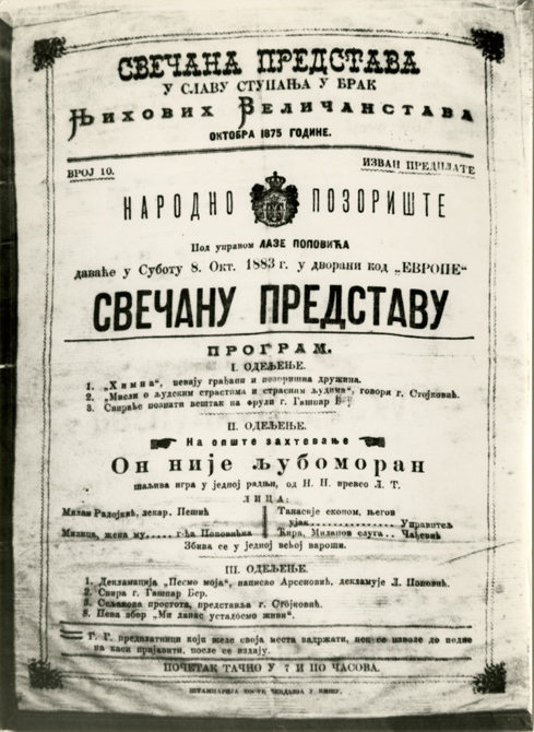 Prvi poznati pozorišni događaj zabeležen je 1883. godine i o njemu svedoči plakat za predstavu, koja je u Nišu izvedena prigodno, povodom godišnjice stupanja u brak kralja Milana i kraljice Natalije Obrenović.