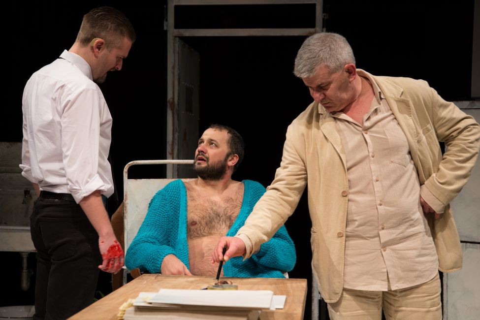 Tačno u 20:00 časova malobrojna publika se uvodi na pozornicu i raspoređuje na onoliko mesta koliko je moguće, na uvek rasprodatu predstavu koju je zaista potrebno pogledati ovako izbliza. Ispred nas je štrik na kome vise krvave plahte i na scenu dolazi Milijana Makević u ulozi pralje te skuplja plahte uz zvuke upaljenog televizora, otkrivajući nam nagog čoveka koji je sve vreme stajao iza njih sa kukuljicom na glavi drhteći na belim, krvavim pločicama. Njemu se uskoro pridružuju dvojica inspektora, Tupolski i Arijel, koje tumače Saša Torlaković i Branislav Jerković, gurkajući ga u prolazu pre skidanja kukuljice i otkrivanja lica ovog očiglednog istovremenog okrivljenika i žrtve. Ovaj čovek, koga se sećamo kao Homenides-a iz “Bube u uhu” je Ninoslav Đorđević, koji nas je sada dočekao u sasvim drugačijoj priči, oživevši ulogu Katurijan K. Katurijan-a pred našim očima i ostavivši nas da bez daha pratimo njegovu priču.