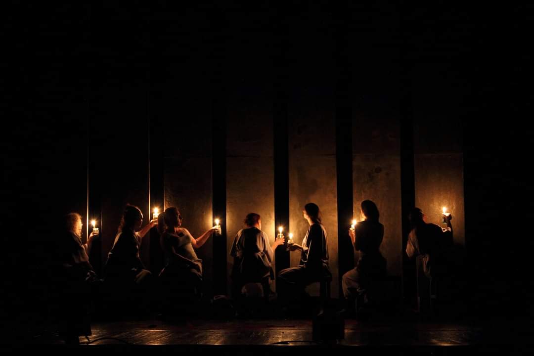 Publiku dočekuje ovih sedam Žena koje u pravoj liniji direktno okrenute nama sede na pozornici i pletu crvenu tkaninu. Iza svake nalazi se po visok zid, sa svetlošću koja kao da izbija iz svake Žene. Sve one su različite, a opet nekako iste; sve one imaju naizgled drugačiju, a opet istu priču. Poprilično jednostavna scena i jednostavni i jednobojni kostimi nisu nikakav nedostatak, shvatam dok gledam predstavu. Jedino na šta želite i možete usmeriti svoju pažnju jesu ove Žene i njihove priče, a to je izgleda sasvim dovoljno.