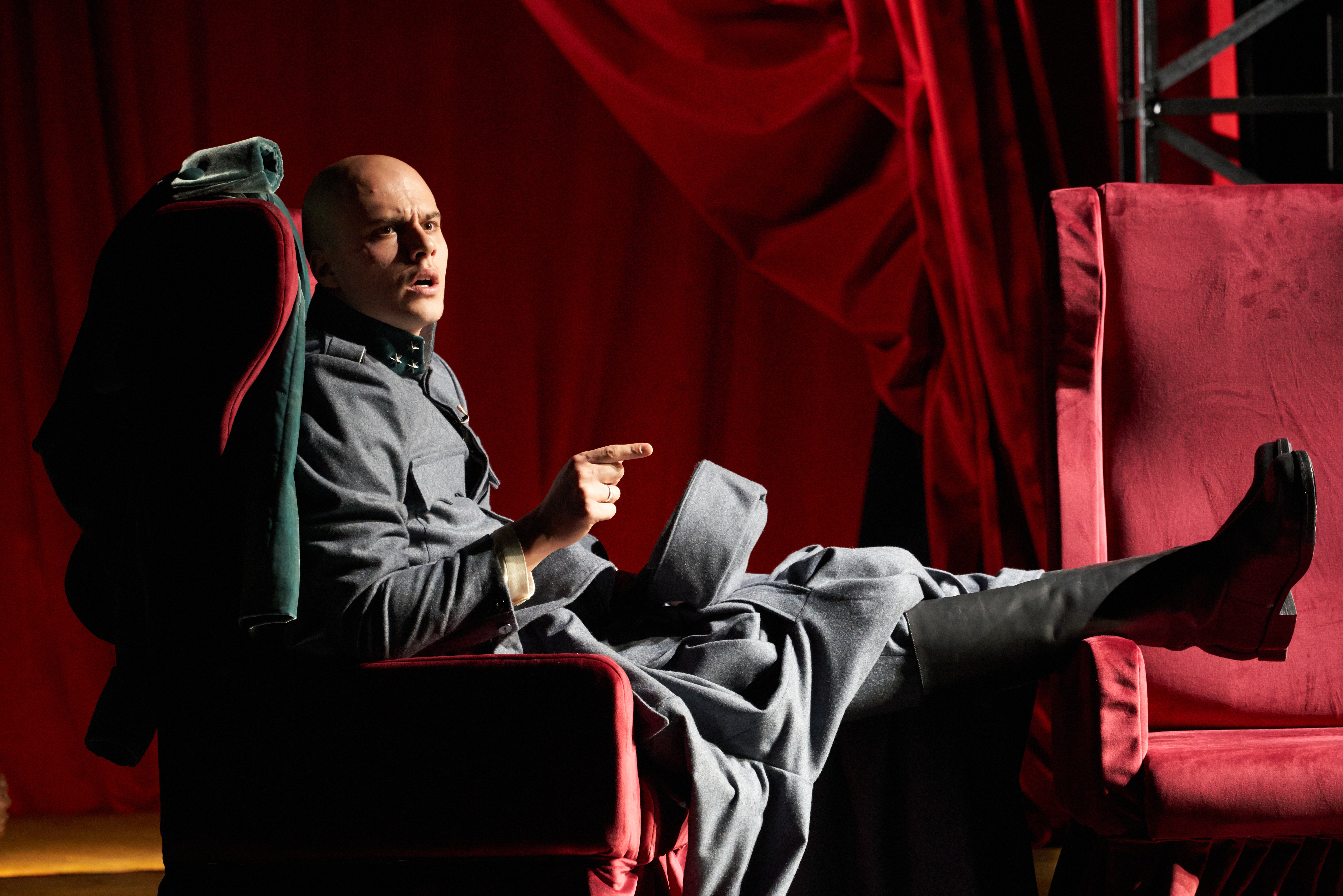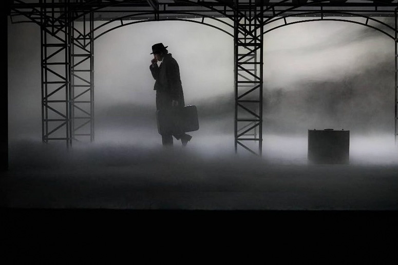 Predstavu sa balkona otpočinje glumac Joakim Tasić, koji se iz mrklog mraka pojavljuje i uzrujano izgovara svoj tekst. Njegova koncizna dikcija, koja drži kontinuitet do samog kraja komada, daje nam do znanja da mu tema o kojoj govori nije daleko od srca. Nakon monologa, on nestaje, a radnja se prebacuje na scenu, gde počinje vizuelni spektakl. Stojanović je uskladio režiju i scenografiju, na kojoj takođe potpisuje rad, tako da segmenti zajedno budu izvodljivi u praksi, ali estetski ni nalik nečemu već viđenom u pozorištu. Dim koji preokupira celu salu nakon podizanja zavese povlači nas u priču i odvodi na železničku stanicu, mističnu i jezivu, gde upoznajemo naše glavne junake. Kada govorimo o izgledu scene tokom celokupne izvedbe predstave, može se reći da je lestvica upečatljivosti podignuta na stepen više. Kako bi nam bolje dočarao atmosferu, scenograf je na žičane „perone” postavio praktikable i na njima napravio dva kupea, što je veoma iznenađujuće za savremeno pozorište, s obzirom da je ovo jedna od retkih predstava koja se igra „na visini”, a ne na uobičajenoj pozornici. Igra sa rasvetom, koja je očarala većinu, dodatan je kompliment vizuelnom identitetu izvedbe i sjajan način kako istaći radnju koja se trenutno odigrava na sceni.