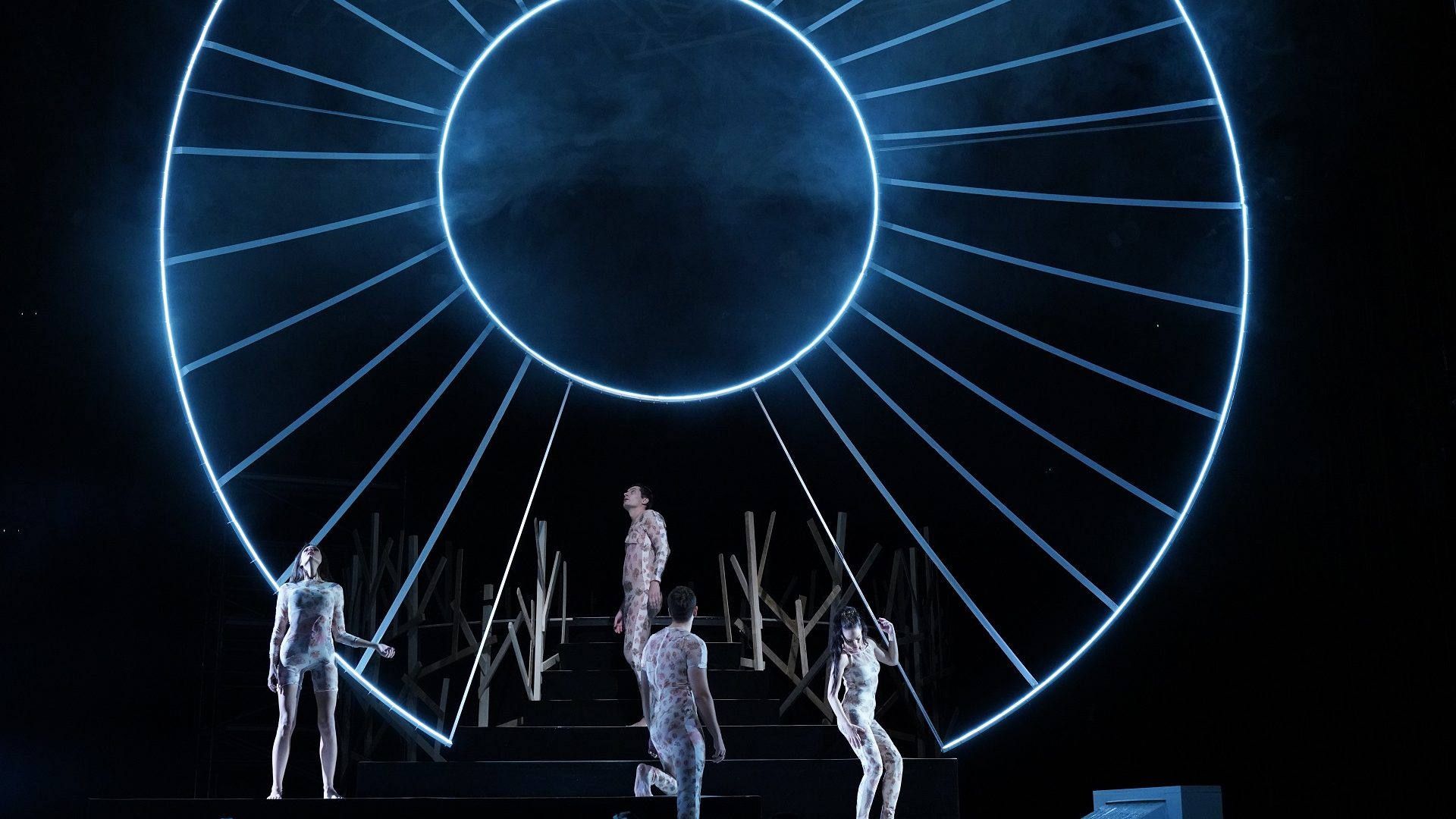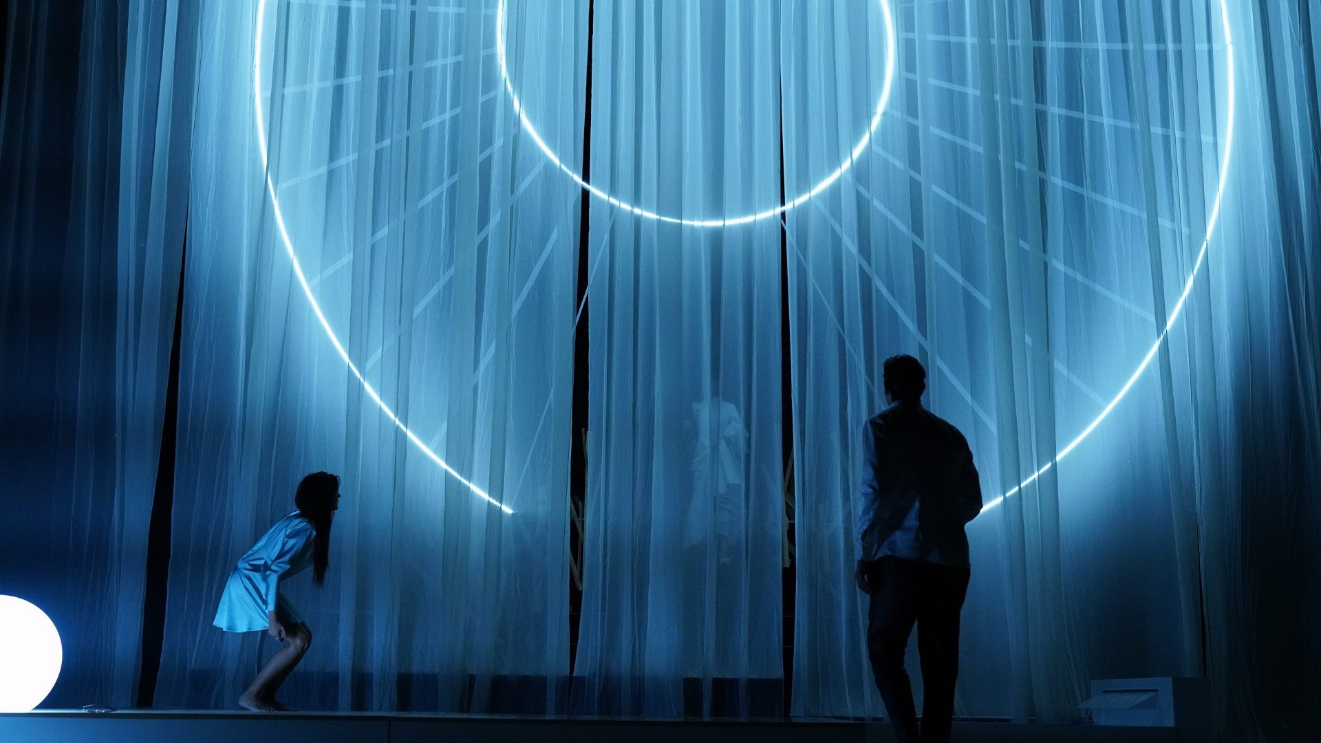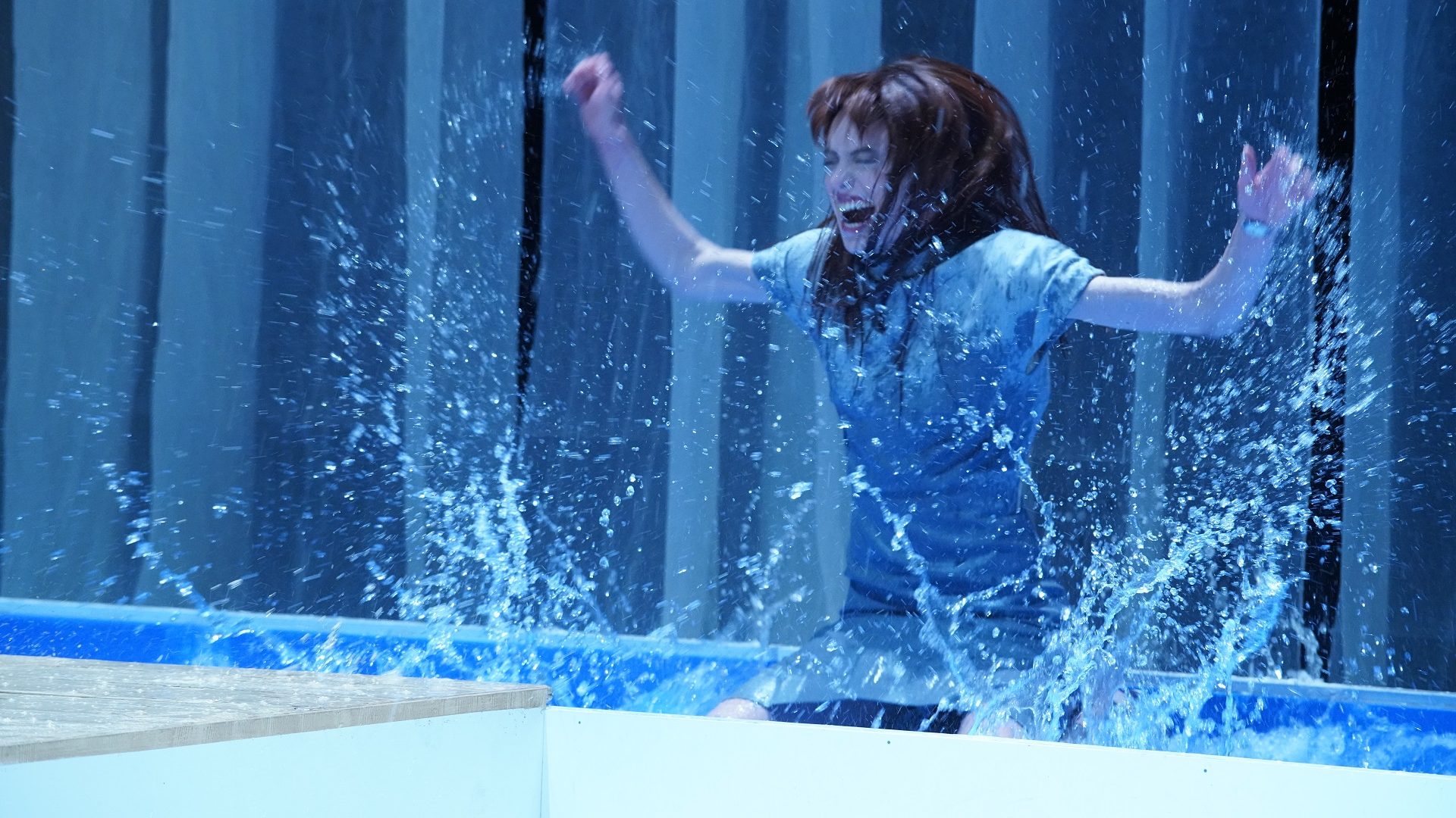 Predstavom dominira salonska atmosfera ispraznih, mondenskih razgovora o lepršavim aferama, ambicijama i tračevima, što se ogleda i u svedenoj scenografiji Jasmine Holbus, gde se u prvi mah jedino ističe pomenuti bazen usred salonskog nameštaja. Ipak, na polovini predstave odvija se dionizijski pir i scena se otkriva u potpuno ekspresionističkom maniru, otkrivajući nam platformu usred mraka, sa koje se spuštaju mladenci Bubi (Miodrag Dragičevič) i Irena, u gotovo nadzemaljskom prizoru eterične, spiritualne ljubavi – što se postavlja nasuprot sirovoj telesnosti ostalih, koji se upuštaju u kanibalističke orgije. Kostimsko rešenje Selene Orb u ovoj sceni indikuje kompletnu nagost svega i svja, okupajući pomenutu platformu u karnalnoj požudi i krvi.