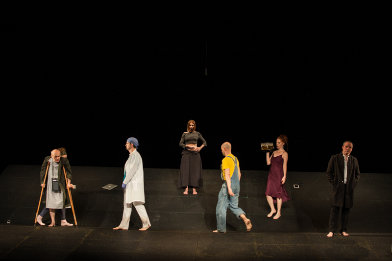 Scenografije gotovo i da nema, što je dobro rešenje jer se stavlja akcenat na likove, njihovu priču i dijaloge. Vreme i mesto potpuno su irelevantni u ovoj predstavi, te bi neka „realna” scenografija u vidu spavaće sobe, bolnice ili kafića u kojima se radnja odvija – bila suvišna i nepotrebna. Igra svetla ima ključnu ulogu jer se pomoću nje vrši promena scena i prostora u kom se radnja odvija. Savremeno obučeni likovi su postavljeni na crnu podlogu koja je pod nagibom, a od predmeta su tu samo telefon, tablet i laptop. Kako je teže kretati se pod tim nagibom, scenografiju možemo čitati kao simbolički izraz teškog životnog puta i neke vrste prepreke do čijeg se vrha i velikim naporima teško dolazi.