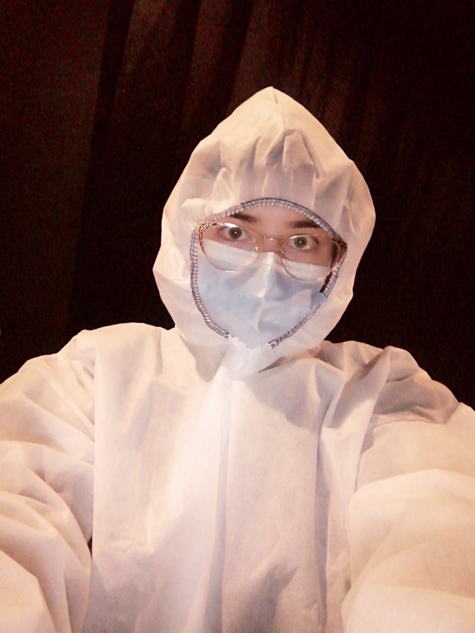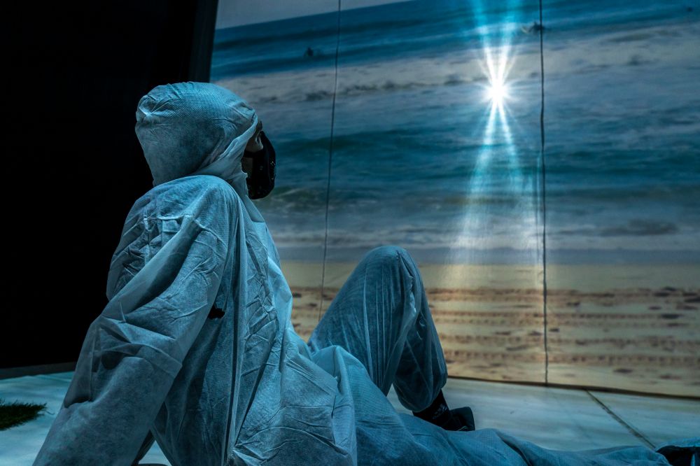 Dobijamo skafandere da ih i mi sami obučemo (nas tri krademo trenutke da napravimo brzinske fotografije sebe u skafanderu, valjda da se pohvalimo svojim virtuelnim prijateljima). Tako obučeni dovedeni smo u prostor gde se predstava dešava, crnu kutiju od zavesa na koje se projektuju video materijali. Na podu su samo 5 sunđera za ležanje i nas petoro. Obučeni u kombinezone, sa sve maskama na licima, potpuno smo obezličeni, i umesto da budemo publika, ekstremno mala, ali zajednica, stajali smo zajedno, ali sami. Svako sam sa sobom i u sebi, i sa mašinom (ovo me je neodoljivo asociralo na našu svakodnevicu).