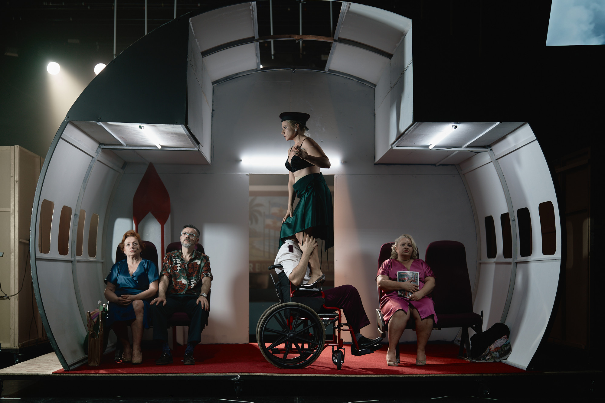 Scenografija se menja velikom brzinom, pokretna je i fluidna kroz sva četiri čina. U četvrtom činu to je avion u kom se (ne) putuje ka Moskvi, ili možda ka nekom nepoznatom, nedosanjanom i nedostižnom mestu. Potom se pred publikom otvaraju prostori trpezarije i sobe, dok u prvom činu likove posmatramo u i oko bazena. Svetlosni efekti i uživo izvođenje muzičkih numera dopunjuju slojevitost rediteljske zamisli. Oni nisu samo prateći elementi, već postaju i važan deo glumačke igre, „partneri” na sceni, koji u stopu prate i pojačavaju glumački izraz.