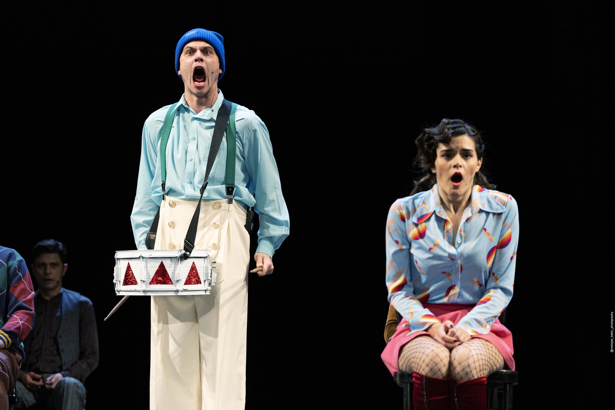 Pre svega, šareni kostimi i razigrana scenografija, ali i način na koji se scene dinamično smenjuju poput komičnih skečeva, stvaraju prividno prijatnu i lepršavu atmosferu. Ipak, publika ubrzo prepoznaje satirični ton i čitava priča postaje izmeštena. Odjednom nam se osmesi likova učine usiljenim, a njihova dela sebičnim, te možemo da razumemo zašto je Oskar doneo svoju radikalnu odluku. Pa opet, ne smemo zaboraviti da je ono što gledamo niz prisećanja glavnog junaka koji je u trenutku pripovedanja pacijent duševne bolnice. Dakle, sve što znamo o ostalim likovima jeste ono što čujemo od njega. U ovom kontekstu, Oskar je ultimativni nepouzdani pripovedač. Poput Foresta Gampa, njegova životna priča nepredvidiva je i burna, a upečatljive epizode koje je proživeo često srceparajuće. Dok nam pripoveda o svom životu, pribegava limenom dobošu koji na tom nivou funkcioniše kao sredstvo pomoću koga oživljavava uspomene i orijentiše se na putovanju kroz sećanja. Doista, ovaj instrument kao da je zaseban lik u predstavi. On je simbol otpora, pobune, protesta protiv normalizovanih izvitoperenosti, ali i izolacije i zida koji Oskara večito odvaja od okoline. Zaglušujuća buka koju proizvodi Oskaru daje glas koji ponajviše zvuči kao vapaj. Prestravljen idejom da će jednoga dana postati poput odraslih, a svestan da je svakim rođendanom tome sve bliži, on poželi da zauvek ostane mali i od tada limeni doboš postaje neodvojivi deo njega samog, štit od prljavog sveta odraslih i obećanje da sâm na njih nikada neće ličiti. Doboš je i Oskarov verni saputnik, jedina konstanta u njegovom životu. Ako iko proba da mu ga oduzme, on se uznemiri i stane vrištati toliko glasno da visok pisak u trenutku slama staklo – tokom jednog takvog incidenta, nastradale su naočare njegove učiteljice. Vrištanje je još jedan način na koji Oskar pokušava da se zaštiti od surovog sveta, odbijajući da bude njegov deo. Ovaj simbol funkcioniše na još jednom nivou; neraskidivo je povezan sa stvarnim događajem koji se odigrao 9. novembra 1938. godine, širom Nemačke. Reč je o Kristalnoj noći, nacističkom pogromu na čijoj meti su bile jevrejske prodavnice čiji su vlasnici završili ili mrtvi ili uhapšeni. Jedan od najstrašnijih vesnika Holokausta. Štaviše, Sigizmund Markus, prodavac igračaka kod koga Oskar nabavlja novi doboš kada za to dođe vreme, takođe završava tragično, oduzimajući sebi život kako bi se spasio mučenja i ponižavanja od strane režima.