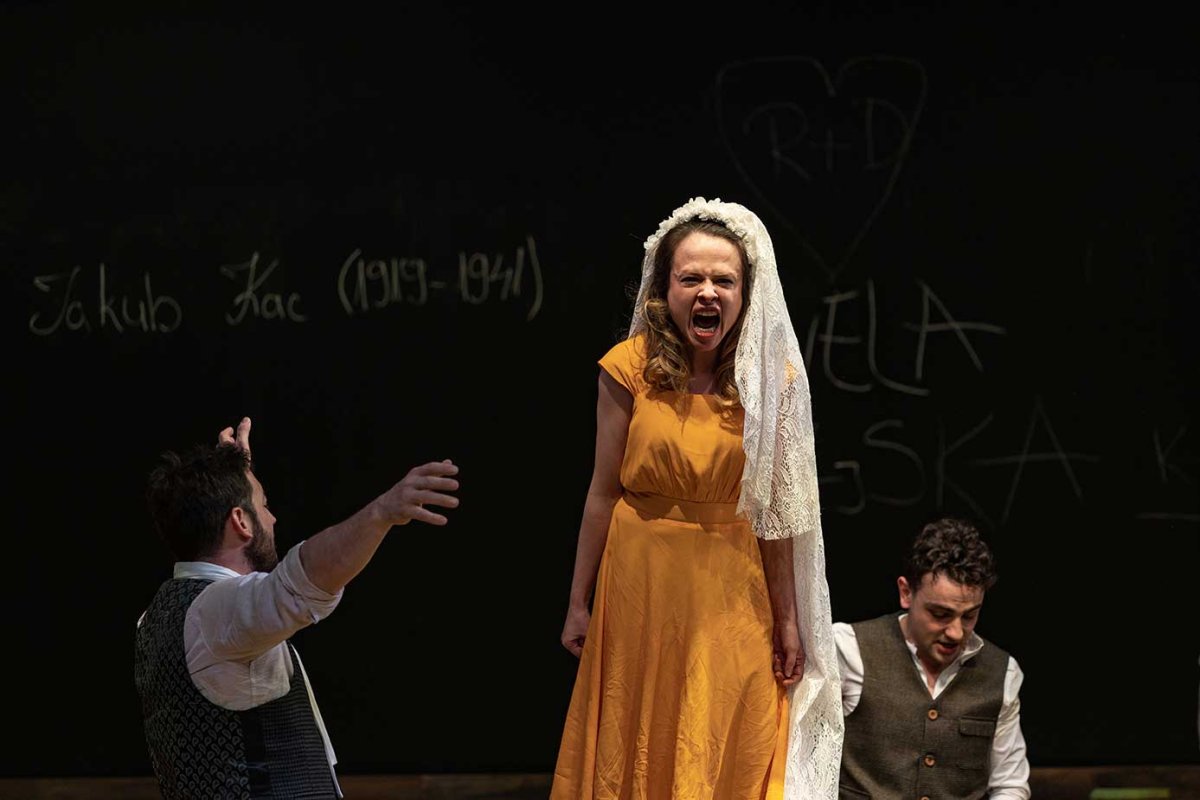 Uzimajući u obzir da predstava obuhvata veliki vremenski period, scenografija se hronološki menja - od učionice koju čine školske klupe i velika tabla, na kojoj će se tokom cele predstave ispisivati poruke, godine rođenja i smrti likova; zatim se scena pretvara u štalu, natrpanu senom, u kojoj su ubijeni Jevreji, a onda se na njoj odigrava svadba, i na kraju ponovo postaje učionica.