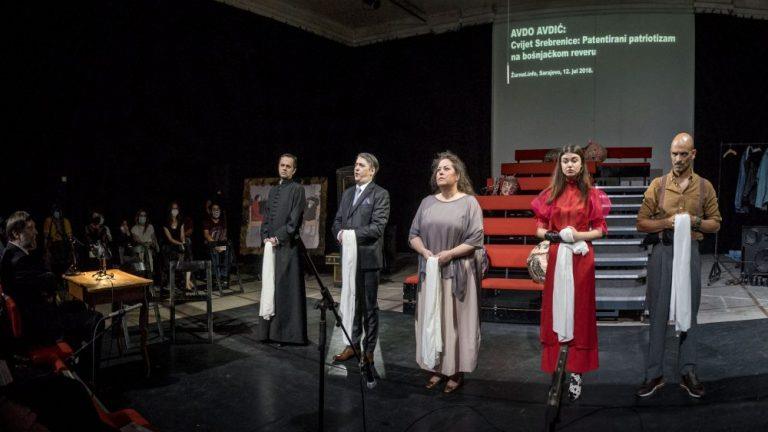 I u tom trenutku kao bumerang vrati mi se natpis sa početka predstave u kome se navodi da uprkos tome što su uglavnom osuđeni izvršioci, organizatori i naručioci genocida u Srebrenici, akademici, pesnici i duhovnici ovog zločina i danas su najugledniji ljudi u našem društvu, te da bi upravo oni morali biti javno prozvani i kažnjeni, kako bi pravedni ljudi mogli da žive ponosno i dostojanstveno. I da, ova predstava bavi se upravo njima – kulturnom i pozorišnom elitom Srbije.