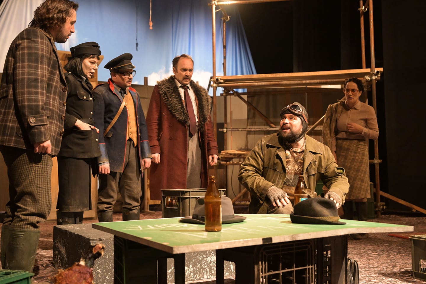 Disfunkcionalna postavka scene sa koje se iščitava sav fatalizam sadašnjice, skriven ispod parola i novinskih referenci o idiličnom dobu, doprinosi karakterizaciji likova koji, u afektivnim nastojanjima da je poprave, još više urušavaju sve njene uglove. Gradilišne skele koje zadiru u poluviseću maketu neba, vizuelno opovrgavaju izverzirana tvrđenja kojima lokalne autokrate zavaravaju narod, a od marginalizovanog ruskog gradića načinjavaju svedočanstvo o, budućnošću obećanoj, distopiji. Splet vremenskih isečaka, takođe, zauzima značajnu simboliku u ovoj adaptaciji; naime, radnja može biti izdeljena u tri vremenske ose – prvu predočavaju kostimi koji impliciraju na logorašku atmosferu Drugog svetskog rata, drugu, koju pripovedaju sami likovi; svakodnevicu gogoljevske Rusije, i, najposle, sliku sadašnjeg društva koje je već uveliko zagazilo u apokaliptične pejzaže prikazane haotičnom scenografijom.