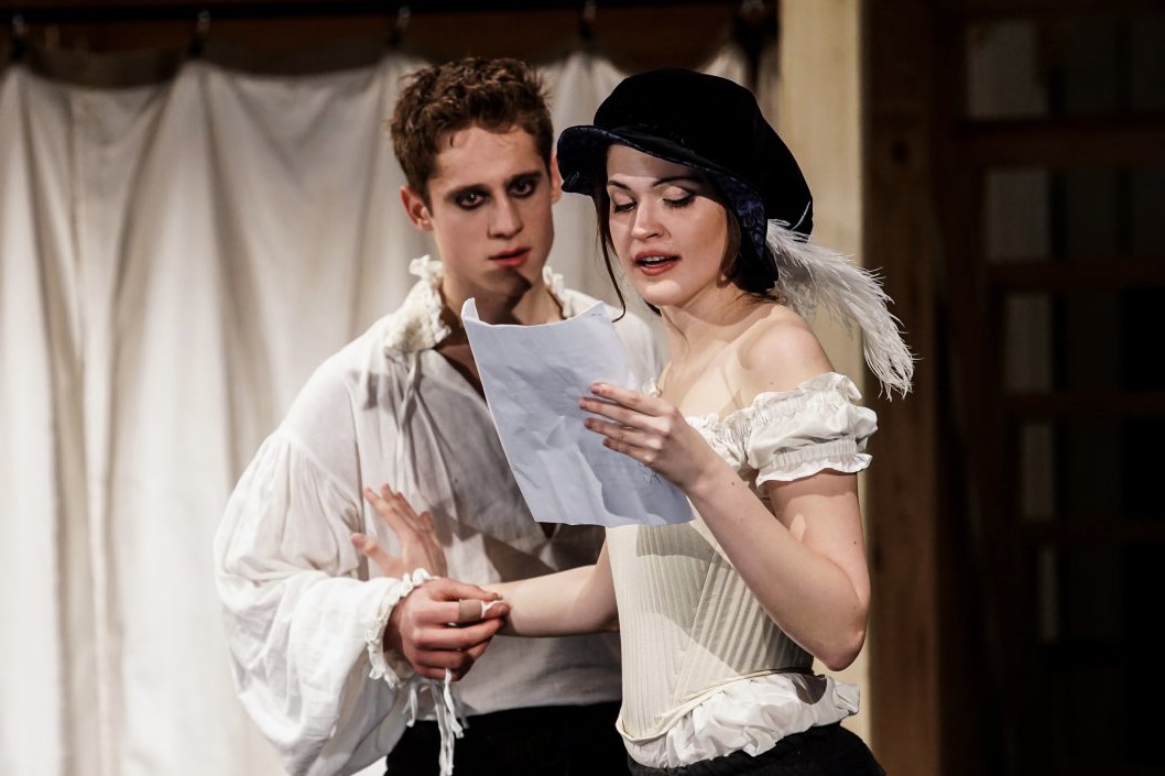 Glumačku postavu čine osamnaest glumaca, od kojih Luka Grbić i Stanislava Nikolić igraju vodeće uloge. Stanislava u ulozi Viole, Šekspirove muze i Romea, sve do kraja predstave ne ističe svoje potpune glumačke kapacitete. Lik Viole u delu predstavlja mladu plemićku devojku, slepo zaljubljenu u pozorište i dela Vila Šekspira, sve dok ne upozna i tvorca svojih omiljenih poema i drama, te se i likom i delom u potpunosti zaljubi u njega. Staša Nikolić, sve do katarze, Violu igra kao razigranu i detinjastu devojku, mladu ženu pred udajom, i takvom izvedbom umanjuje ozbiljnost karaktera i njenu značajnost. Kada se odigrava finalni deo predstave u predstavi, Staša briljira u svojoj ulozi i opravdava svoje glumačke kvalitete. Luka Grbić nijansira svog Šekspira tako da mu publika veruje na svaku izgovorenu reč. Tragične i komične trenutke, mladi glumac iznosi punom snagom na scenu i trijumfuje na samom kraju predstave, dokazujući još jednom ulogom, skalu emocija i umeće koje poseduje, jer sve što oseća ostavlja gledaocima na dlan. Svetla tačka njegove izvedbe Šekspira, jeste trenutak kada imitira Violinu rođaku i time nasmeje punu salu publike.