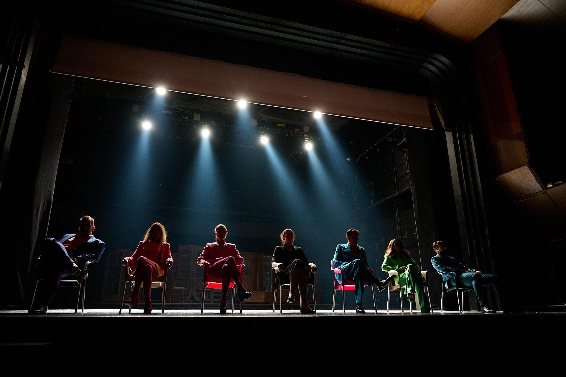 Na scenu stupa rodbina ovo dvoje supružnika, pa zatim (svi su u isto vreme na sceni) neka žena iz vladinog resora, pa ekspertkinja za odnose sa javnošću i buduća direktorka javnog servisa – jedna opšta havarija počinje da vlada na sceni. Nepovezani dijalozi koji nelinearno teku, bez reda i smisla. A glavna glumica tj. novopečena ministarka, koju tumači Dubravka Drakić, samo nepomično stoji sa neprirodnim osmehom koji, kada se posmatra čitava smislenost situacije, ispada iz čitave scenske kohezivnosti, što urušava dinamičnost. Članovi porodice na jednoj strani scene sede za stolom i pričaju jednoglasjem, koje pritom nije bilo toliko usaglašeno, a sa druge strane smenjuju se već pomenute predstavnice određenih institucija. Dok odjednom, ministarka pravi sebi krevet dok oni nastavljaju razgovor, opet, prepun opštih mesta – svako od rođaka želi svoje mesto u ministarstvu i ostalim institucijama, shodno sopstvenom senzibilitetu i interesovanjima.