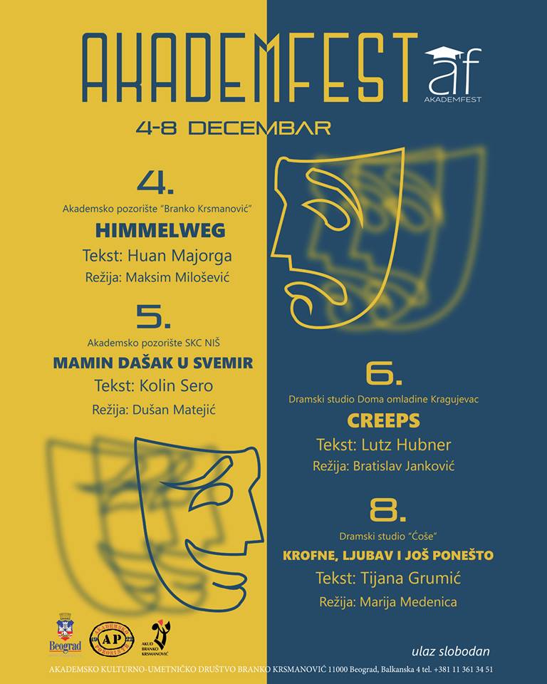 Akademfest u organizaciji Akademskog pozorišta Branko Krsmanović iz Beograda, ove godine, u periodu od 4. do 8. decembra, prikazao je na svom festivalu selekciju malog, ali odabranog broja pozorišnih produkcija akademskih pozorišta iz Srbije.