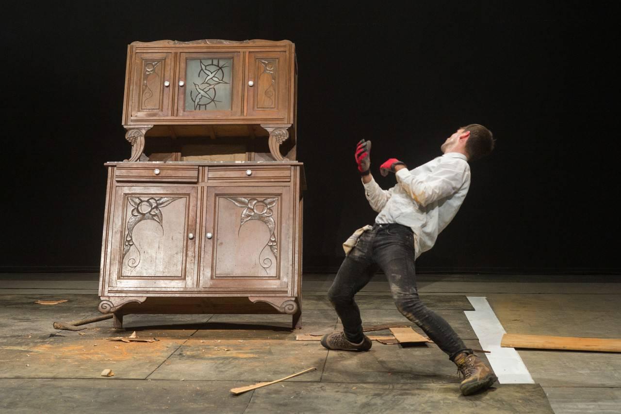Dvojica sredovečnih identično kostimiranih muškaraca na scenu unose poveći stari kredenac iz pravca gledališta. Nakon što je unet i postavljen na centralno mesto ormarić postaje jedini komad scenografije i okupira pažnju vodećih likova koji zahvaljujuci odabiru delimično svečanih kostima i usklađenoj gestikulaciji donekle podsećaju na komične karaktere komedija situacije. Njihova imena nisu poznata, a postavljeni su tako da se za kompletno vreme trajanja predstave i ne zapitamo kako se zovu i odakle dolaze naši protagonisti. Jasno je da je stari kredenac takođe u fokusu pažnje publike i samim tim postaje živi lik onoliko koliko su i sami akteri pratećeg čina. Ubrzo primećujemo da je uz desnu stranu scenografije postavljen radiokasetofon. Počinje čišćenje prašine i priprema za novi početak uz vedar duh, burleskne gegove i songove kasetofona, a sve to da bi se aktari eksperimetnalnog performansa kroz nekoliko minuta okrenuli rušenju kredenca posredstvom tupe strane sekire i dveju metalnih bukagija. I sve to — bez reči.