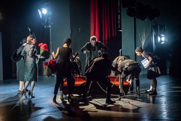 Kašmirna bordo zavesa spušta se dok se na sceni odigrava fenomenalni prizor - rodbina je zatočena u staklenoj kućici unutar vrtloga novčanica koje mučno pokušavaju da uhvate. Slikovito predstavljanje gušenja od strane sopstvene pohlepe, dok devojčica, glumica Aljona Tertova, odlazi s koferom u ruci, daleko od tog sveta, daleko od tih licemernih ljudi.