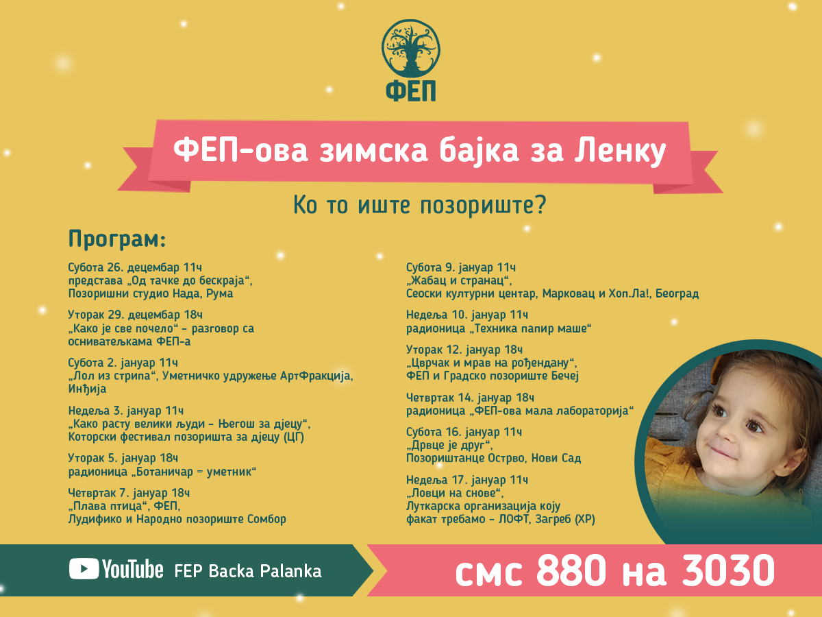 Otvorite svoje kalendare, planere, pametne telefone i upišite podsetnike za predstave, jer baš kao u pozorištu, nema odloženog gledanja. Ali ovog puta ima i komentarisanja, hrane, pića, i svega onog što inače ne radimo u pozorištu, ali kod kuće smemo. Zato obavestite sve drugare i drugarice, mame i tate, braću i sestre, bake i deke, tetke i teče, strine i stričeve, komšije i komšinice, ama baš sve, da je zimski raspust upravo postao magičan jer počinje FEP-ova zimska bajka za Lenku!