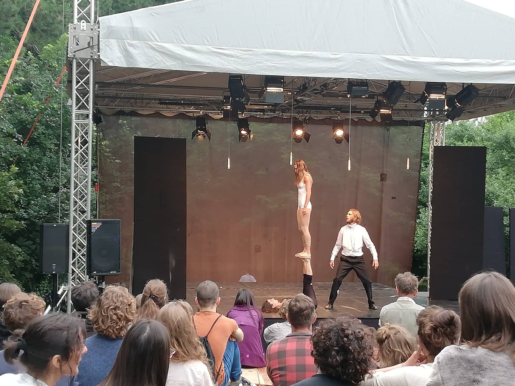 Ipak, odlučujem da se, kao i većina ljudi u publici, fokusiram na pozornicu i gledam šta ova dva mlada umetnika (Jakob i Jean-David) sa Akademije Teatro Dimitri imaju da pokažu. I … zaista imam šta i da vidim… Cirkuski elementi koji su dovedeni do savršenstva i u ulozi pozorišne umetnosti izmamljuju mi osmeh. Najpre se osmehujem stidljivo, kao da se krijem da me neko ne vidi. Nedugo potom, potpuno se prepuštam i odjednom čujem svoj smeh. Onaj iskreni i gromoglasni smeh koji se kod mene tokom pozorišnih predstava zaista retko javlja. Pokušavajući da pohvatam sve pokrete na sceni dok Jakob (to je valjda onaj viši) baca i hvata stvari, a Jean-David gotovo sve vreme održava ravnotežu na jednom točku i preskače staru limenu kantu i ostale rekvizite koji oko njega lete, osećam da zaista uživam u programu. Potom, hvatam sebe kako razmišljam o tome da li je scena kada se jedan oklizne i padne na sceni greška ili je to planiran deo. Hm... Čim nisam sigurna da li je u pitanju greška, znači da je to potpuno nebitno jer i da jeste njih dvojica su majstori improvizacije koji sve “greške” pretvaraju u komične situcije i bude emociju u gledalištu. Pogledala sam mnoštvo ozbiljnih predstava koje u meni nisu izazvale nikakavu emociju, a jedan, naizgled, amaterski dvojac je uspeo u tome. Bravo!