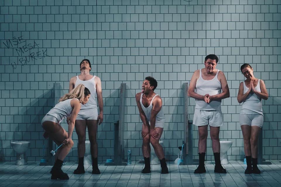 Ne mogu reći da su Andraševe predstave „my cup of tea”, ali „Ibi the great” je…the great! Autorska predstava nastala po drami Alfreda Žarija u kojoj nema čega sve nema. Konverzija „psovanja publike” već nam glumci govore koliko vole nas - publiku. Nikola Knežević nam na početku govori da ponavljamo kao mantru da ova predstava nema nikakve veze sa nama, već se sve to dešava u Poljskoj i nema baš apsolutno nikakve koincidencije sa nama. „Mi smo dobri. To nismo mi.” Izvrsne kreacije monologa, kako privatnih tako i javnih, o položaju glumaca. Glumci se ne skidaju na sceni (znate zašto ovo napominjem), ali tu je jedna bogata scenografija sa obiljem rekvizita - stilizovani wc (ne onaj poljski!) gde na pločicama stoji natpis „Više mesa u burek” podsećajući na omot Pink Floyd ploče „Another brick in the wall”. Dominantan i trijumfalan Nemanja Bakić u svojoj glavnoj roli. Energična, žestoka, nadahnuta, i na kraju apsurdna predstava. Ili ipak ne?