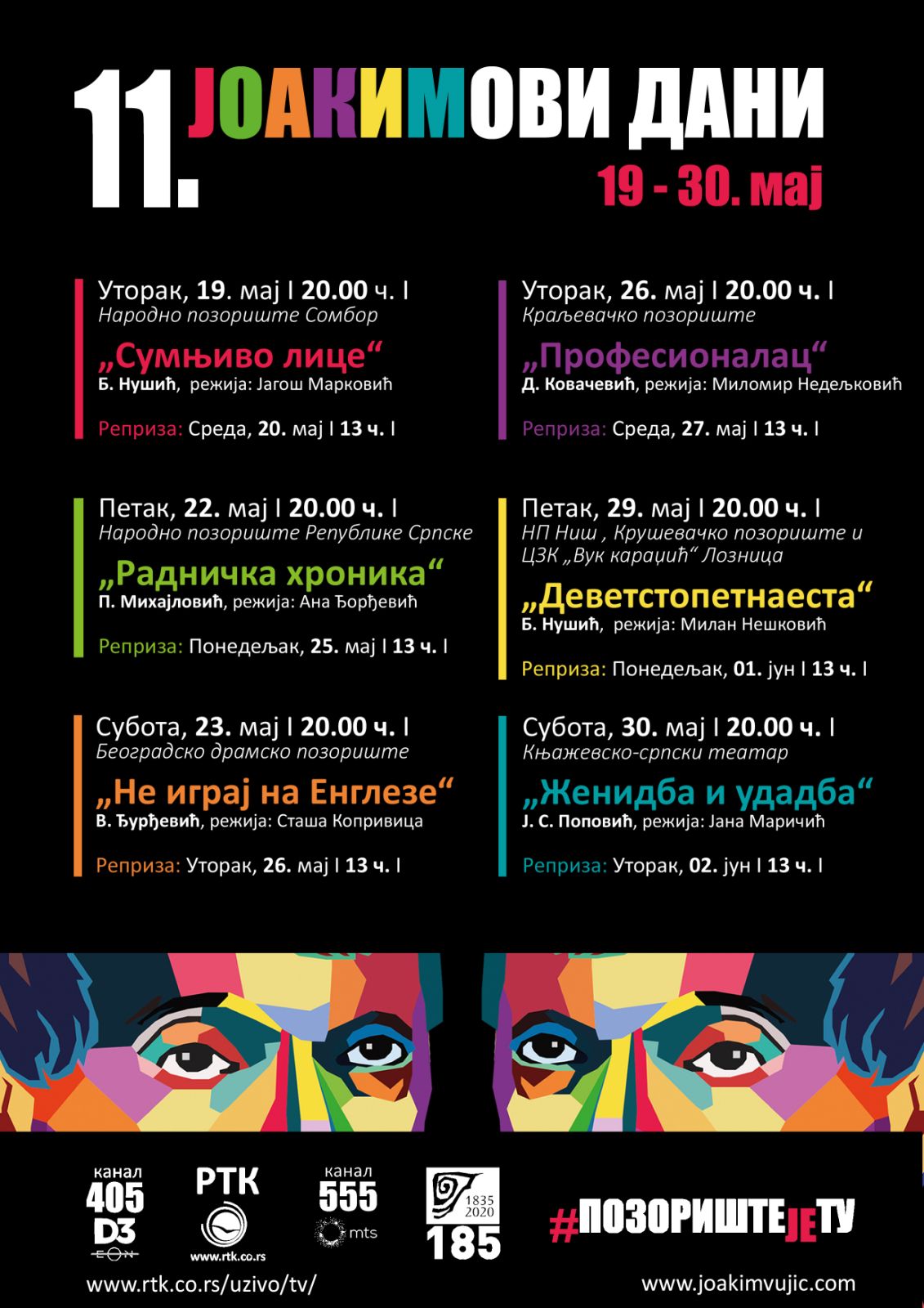 Knjaževsko-srpski teatar, u mesecu maju, već jedanaestu godinu organizuje Joakimove dane, reviju pozorišnih predstava u čast domaćeg pisca. Zbog trenutne situacije u kojoj smo se svi našli i zabrane javnog okupljanja, Joakimovi dani biće realizovani putem emitovanja predstava na Radio-televiziji Kragujevac.