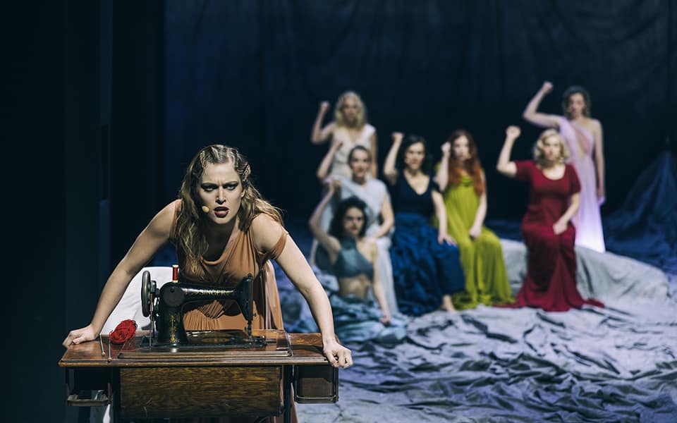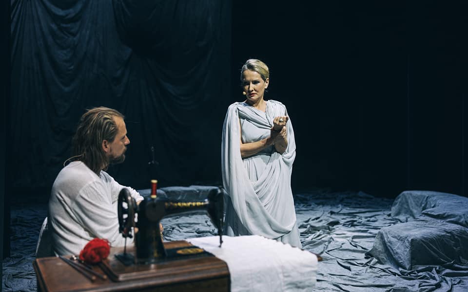 Scenografija je veoma jednostavna i čini je veliko platno koje prekriva celu pozornicu, a u ćošku stoje sto i šiveća mašina (kao simbol jednog „ženskog” posla). Ono što tako svedenu scenu čini intrigantnijom jeste igra svetlima kojom se stvaraju odgovarajuće atmosfere u skladu sa pričom u tom trenutku. Takođe postoji kontrast između blede ležerne tkanine scene i jarkih boja ženskih kostima koji su svi veoma različiti i daju specifičan izražaj svakoj od junakinja, dok se junak promenljive prirode stapa u belilo platna.
