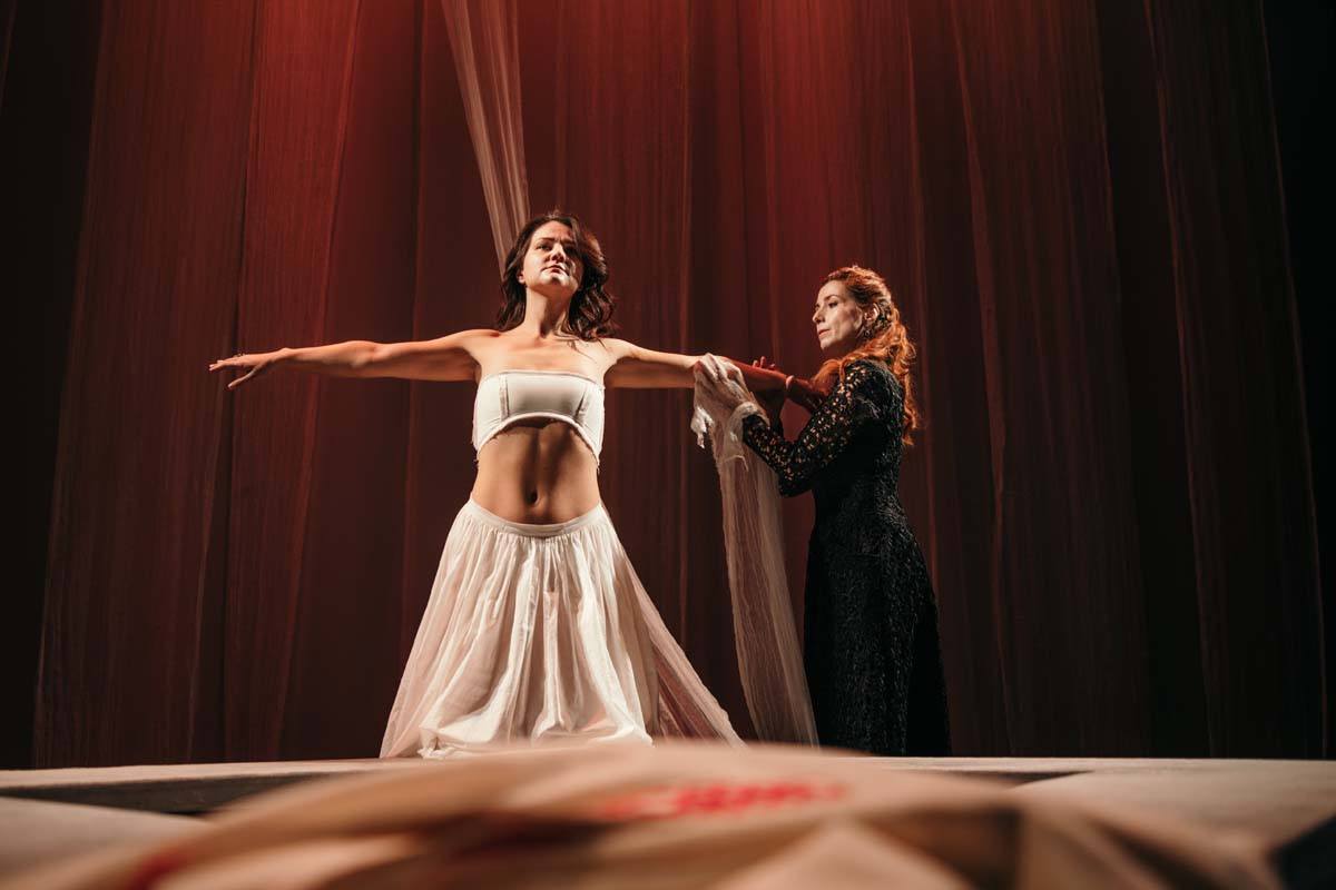 Scenografija je vrlo jednostavna, sa samo jednim velikim belim trouglom koji je delom napunjen vodom. Na njemu likovi sede, peru noge i umivaju se, kupaju, ali on služi i kao simbol za pročišćavanje tela i duše kada je Hasanaginica u pitanju. Njene najvažnije scene dešavaju se u vodi, kao da ona služi da je gura napred, da je očisti od svih nepravdi koje su joj nanete. U vodi je bez dlake na jeziku, oslobađa se stida i sramote i oseća da ima pravo da po prvi put napravi sopstvenu odluku i da zatraži da vidi svoje dete poslednji put pre nego što se opet uda protiv svoje volje.