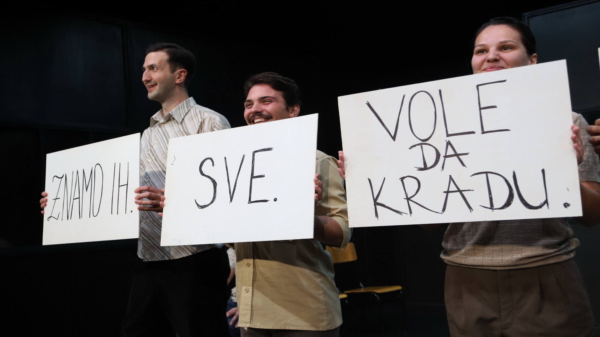 Ova predstava bila bi satira – glumačka rešenja gotovo da su kafkijanski iskarikirana, bezlična, birokratska čudovišta čija se strava ogleda upravo u svoj svojoj izveštačenoj izopačenosti, toliko su stopljena u masu da su groteskna. Bila bi satira da nije surovo realna sudbina RADNIKA, čoveka koji ne stiže da bude čovek zbog nehumanog odnosa nadređenih i podređenih u kapitalizmu. Finalni krik bola je demonstrativno odsecanje prstiju nakon sedamdeset godina uzaludnog štrajka. Demonstrativna krv na prozorima scenografije, neke birokratske ustanove, Sedamdeset godina, i preko, čeka mrtve radnike u nekom birokratskom posmrtnom limbu, gde oni i dalje čekaju na rezultat svog uzaludnog revolta. Dok ih njihov vođa zatrpava samrtnom zemljom.