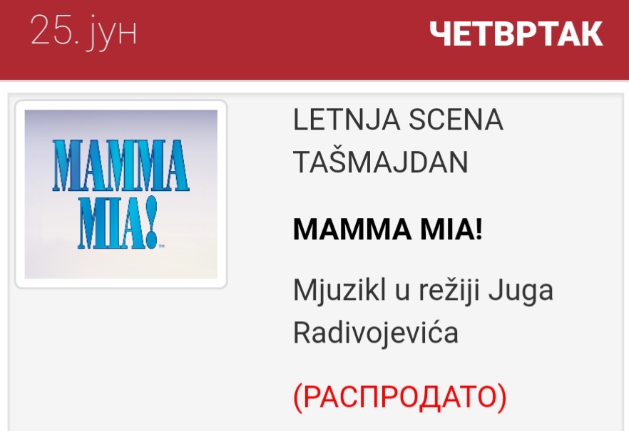 Međutim, karte za mjuzikl "Mamma mia" Pozorišta na Terazijama, koja je i prva predstava na letnjem repertoaru, nisu ni stigle do biletarnice. Kako nam iz tog pozorišta kažu, svih 1200 karata za obe večeri (25. i 26. juna) rasprodate su u 00:00, čim je počela onlajn prodaja!
